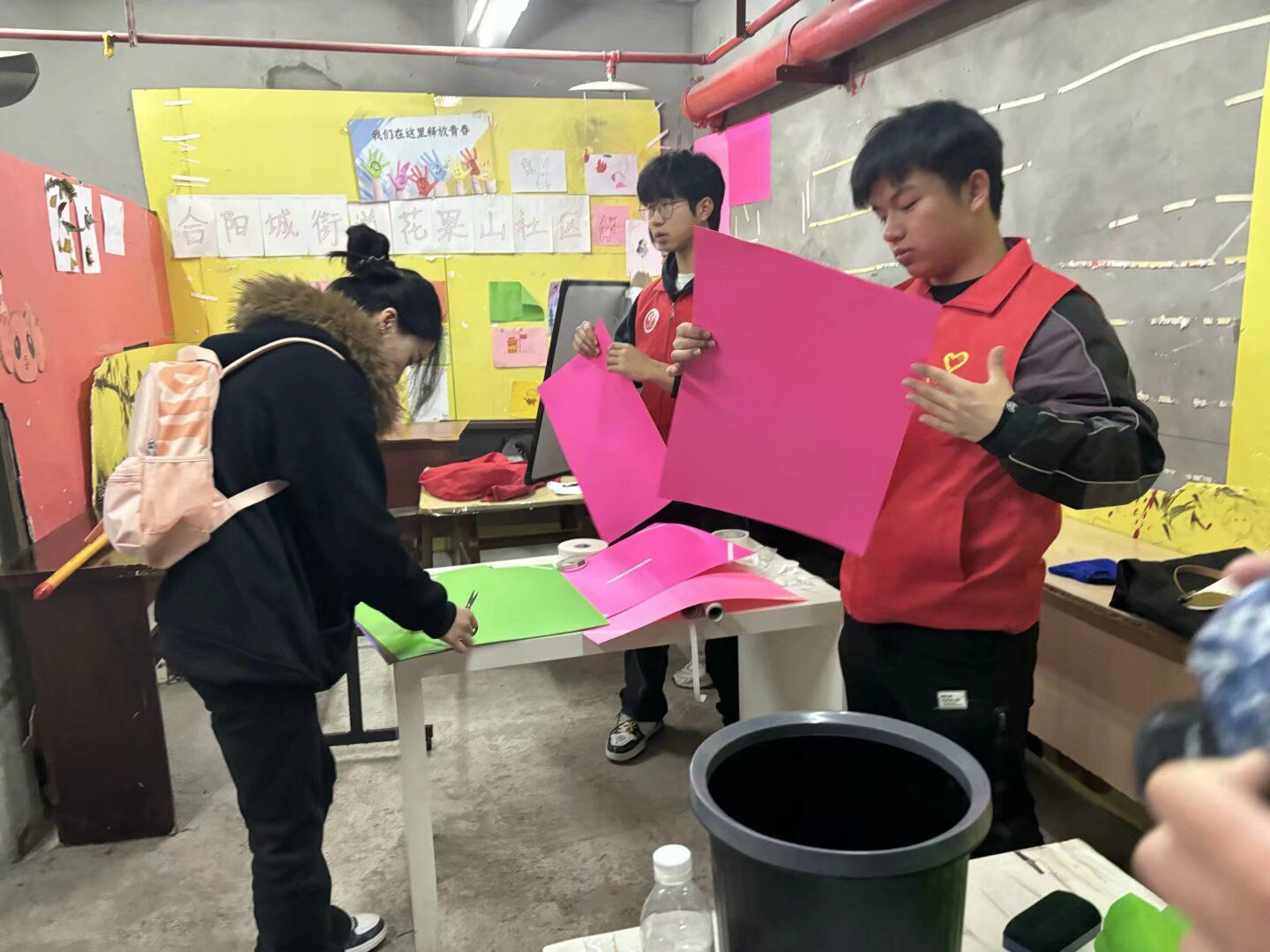 活动中期,志愿者们带领孩子们进行阵地装饰和卫生打扫,用各种不同颜色的卡纸粘贴在背后的白墙上,并且还粘贴了各种学习贴纸,为营造温馨舒适的学习生活环境。在此过程中,精心设置了多个生活技能小课堂。“简单家务劳动” 课堂上,志愿者耐心教导孩子们用抹布擦拭桌椅等家具,让孩子们在实践中体会劳动的乐趣与价值,掌握基本家务技能。