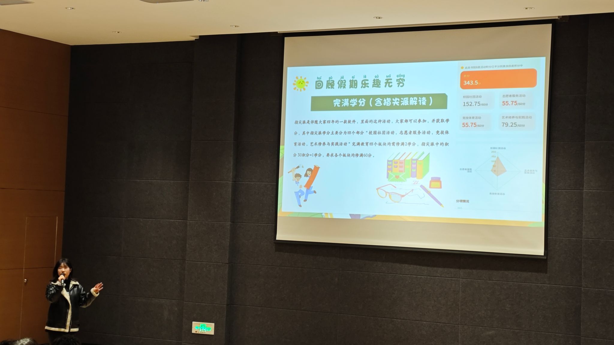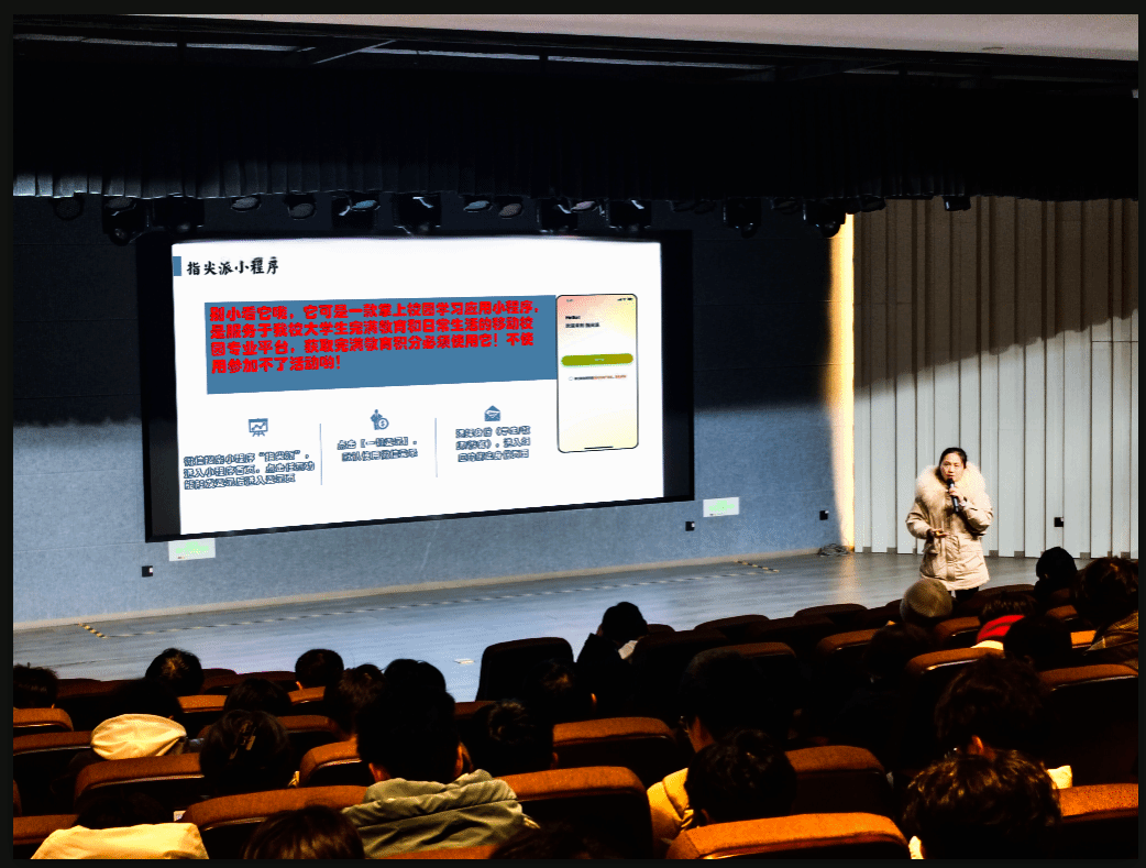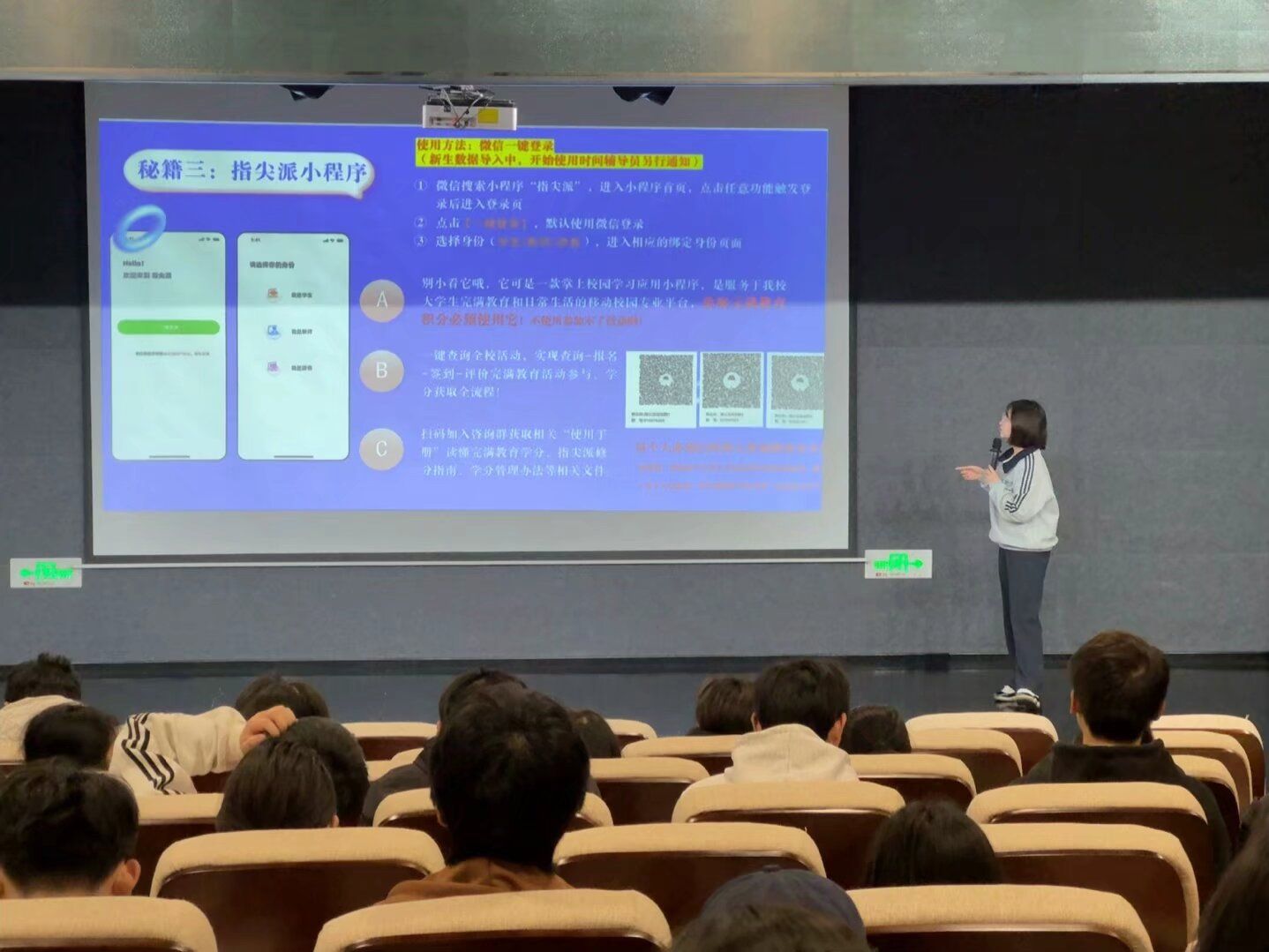 接下来辅导员老师们为同学们介绍了微信小程序“指尖派”,在“指尖派”上就能及时进行活动查询、报名和评价、学分累计和记录等相关情况,同学们可以更好的掌握学分进度和规划后续活动,朝着毕业所需的学分目标稳步迈进。“指尖派”不仅是学分管理工具,还是社交平台,同学们能交流活动心得、分享精彩瞬间,结识志同道合的伙伴,为个人成长注入新动力 。