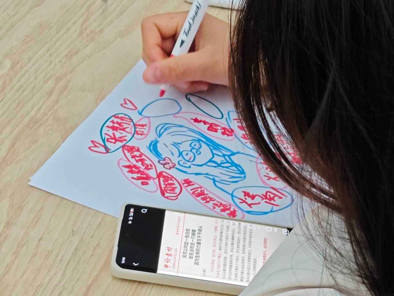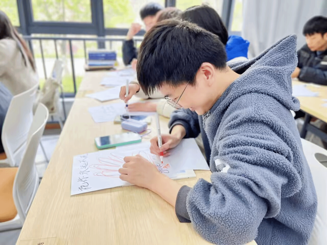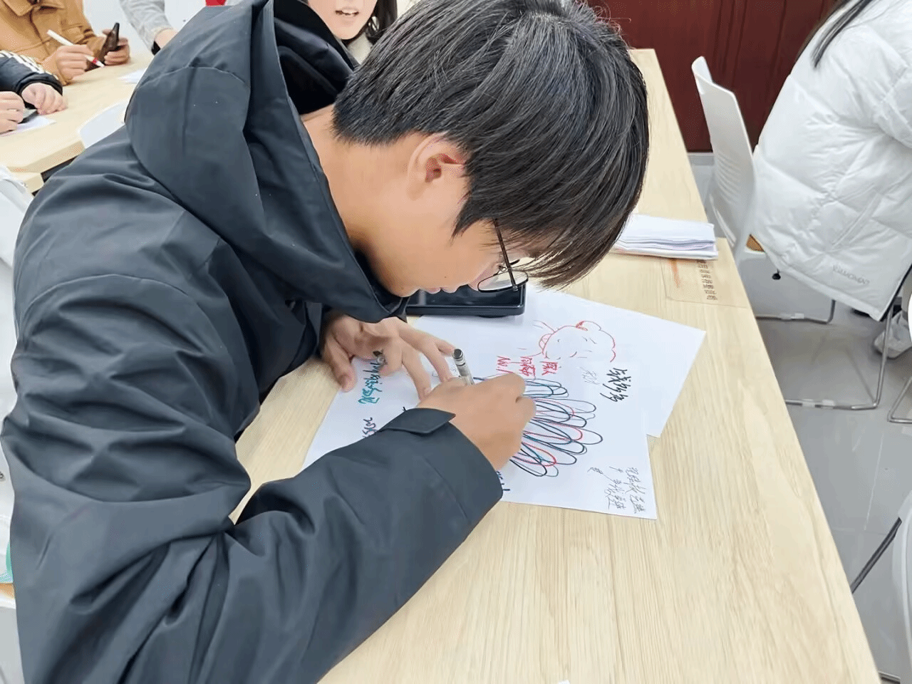 活动以“幸福泡泡”环节拉开序幕。参与者们在A4纸上绘制卡通自画像,并用七彩笔触勾勒泡泡,记录生活中的小确幸——从感恩的瞬间到喜爱的书籍,每一笔都成为情感的载体。2024级学生张同学分享道:“画下今年吃到家乡美食的回忆时,仿佛重新感受到了那份温暖。”