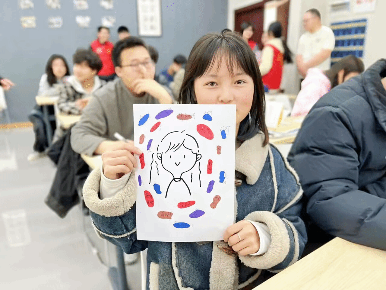 活动高潮“我希望爱我的人的样子”环节,主持人引导大家用画笔分解“爱心”,描绘亲情与期待。一颗心被分割成“妈妈的唠叨”“朋友的拥抱”等板块。活动现场,有的同学将“妈妈的唠叨”具象化为清晨催促起床的场景,笔触间饱含着对这份日常关怀的珍视;还有同学把“朋友的拥抱”描绘得生动形象,定格住朋友给予自己支持的瞬间。这些画作展现出的不仅是同学们的绘画技巧,更是他们对爱细致入微的感受。