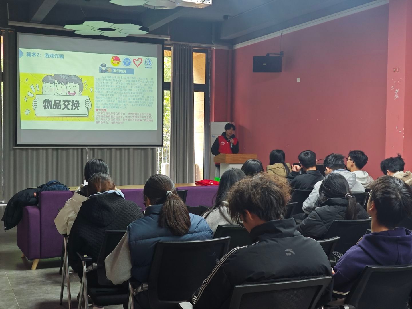 当日下午,同学们聚集在会堂,活动在热烈的氛围中拉开帷幕。首先上演的是精心编排的反诈主题剧本。这部剧本由学校支队创作,取材于真实发生的校园诈骗案例,剧情贴近学生日常生活,涵盖了当下最为猖獗的网络刷单诈骗、冒充公检法诈骗以及校园贷诈骗等典型骗局。观影结束后,支队负责人结合影片情节,剖析了“高薪招聘”“网络赌博”“杀猪盘”等常见诈骗手段的运作模式,并强调:“诈骗并非遥不可及,它可能伪装成任何看似合理的机会。唯有保持清醒,才能避免成为下一个受害者。”