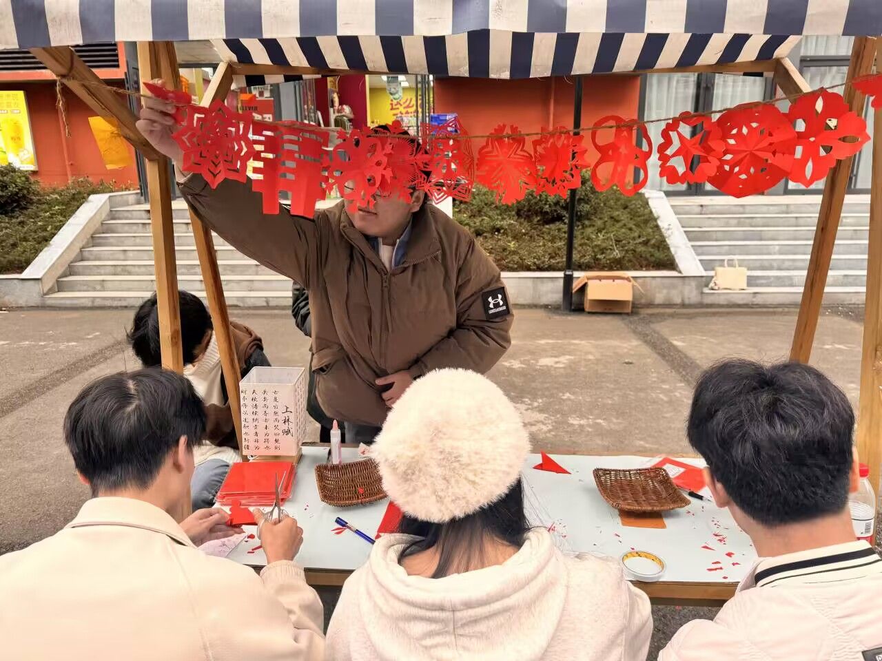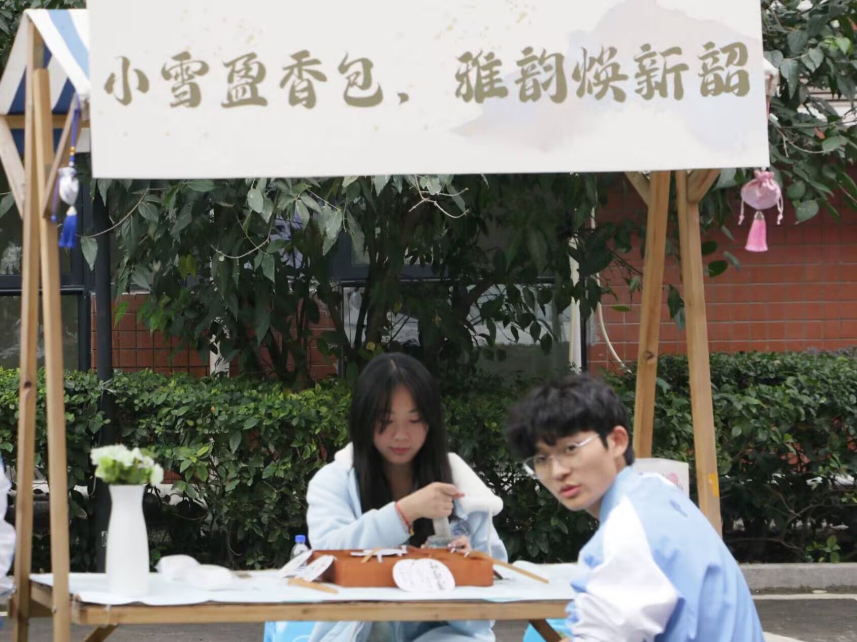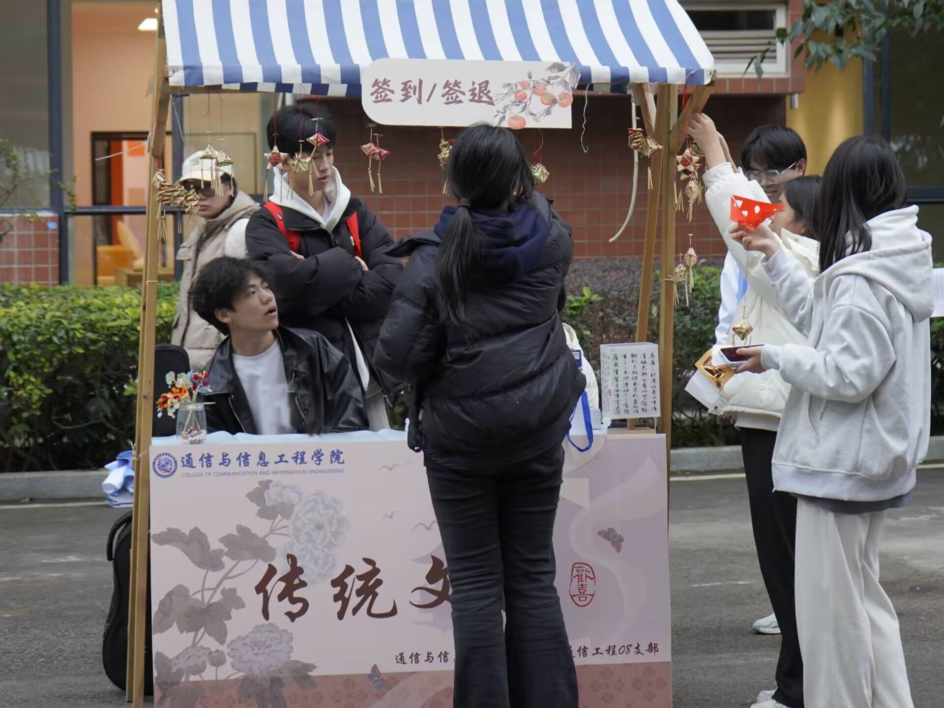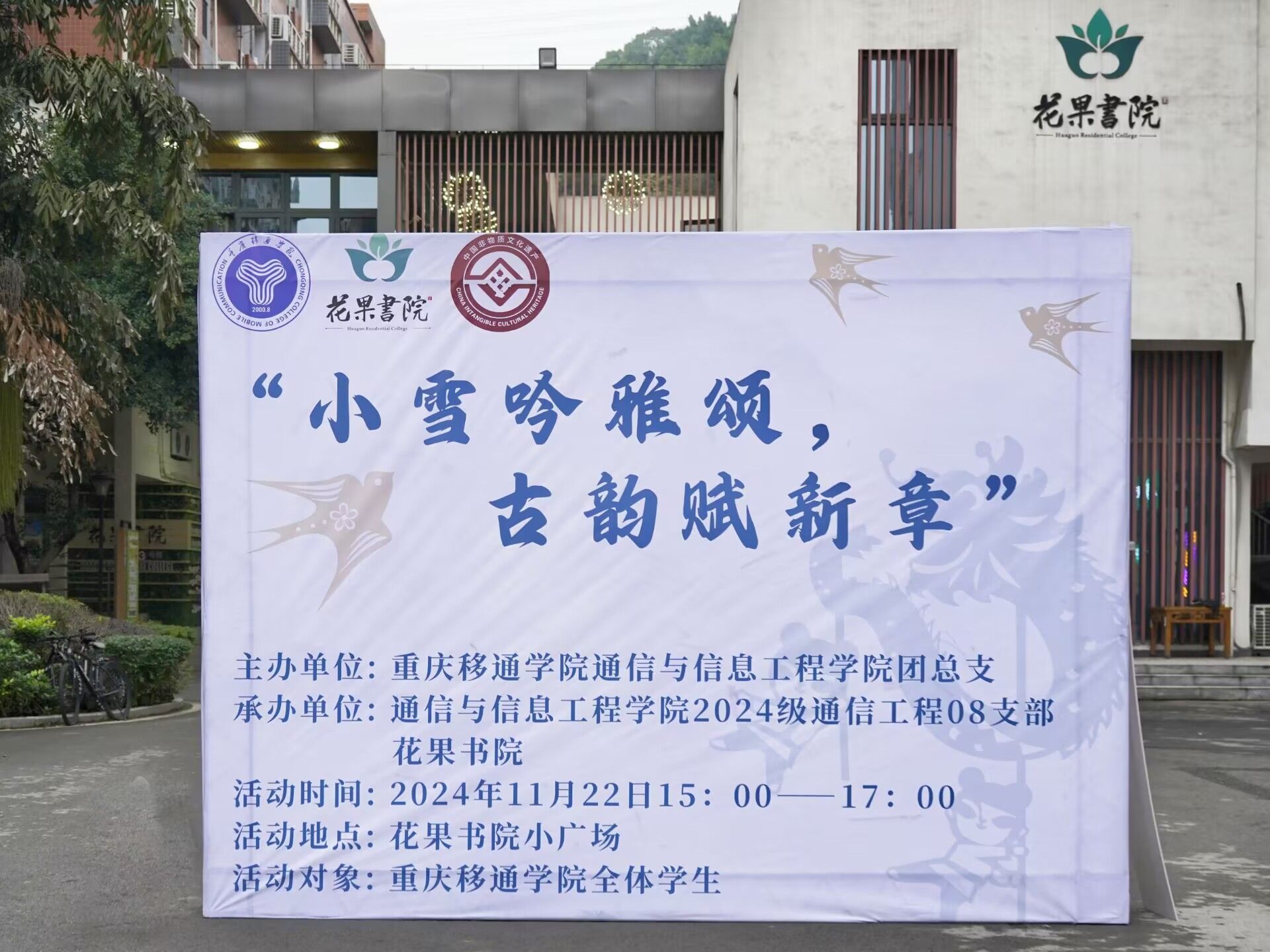 2024年11月22日15时,为多维度传承与弘扬传统文化,增强同学们的文化认同感与民族凝聚力,2024级通信工程08支部联合花果书院于花果书院小广场举办了“小雪吟雅颂,古韵赋新章”完超活动,此次活动同学们可以在非遗拓印、香囊、剪纸、香牌、烧箔等活动中体会到传统手工艺的魅力,于节气中体会自然时序之变。