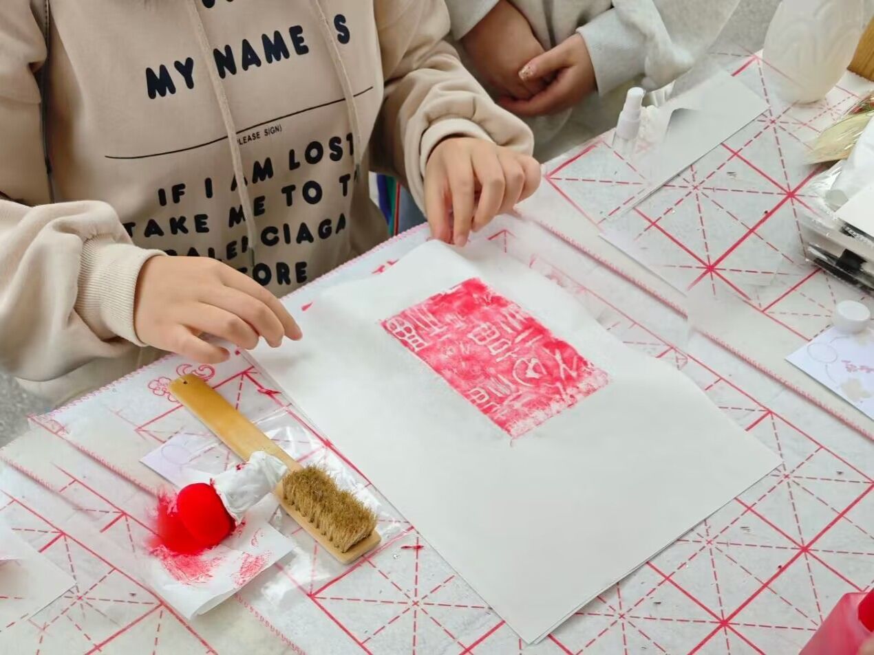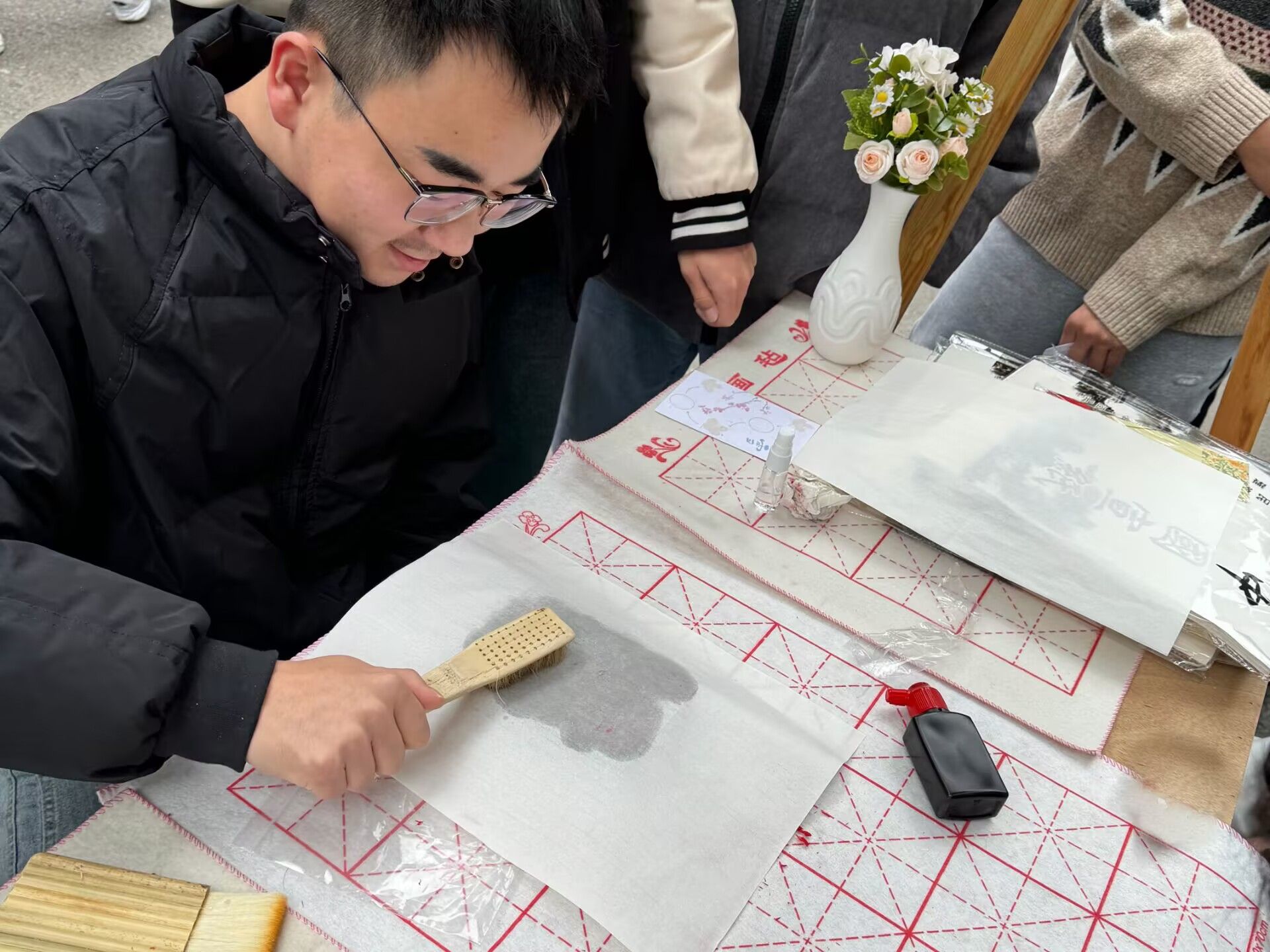 现场,一方方古朴的石碑、雕版静卧,在工作人员的指导陪同下,同学们轻执拓包,蘸墨、捶打、印染,绵密墨点在宣纸落下,历史纹路渐次浮现。这不仅是图案的复刻,更是传承民族的文化根脉。非遗拓印扎根于华夏厚土,让同学们于墨色洇染中,筑牢文化自信基石