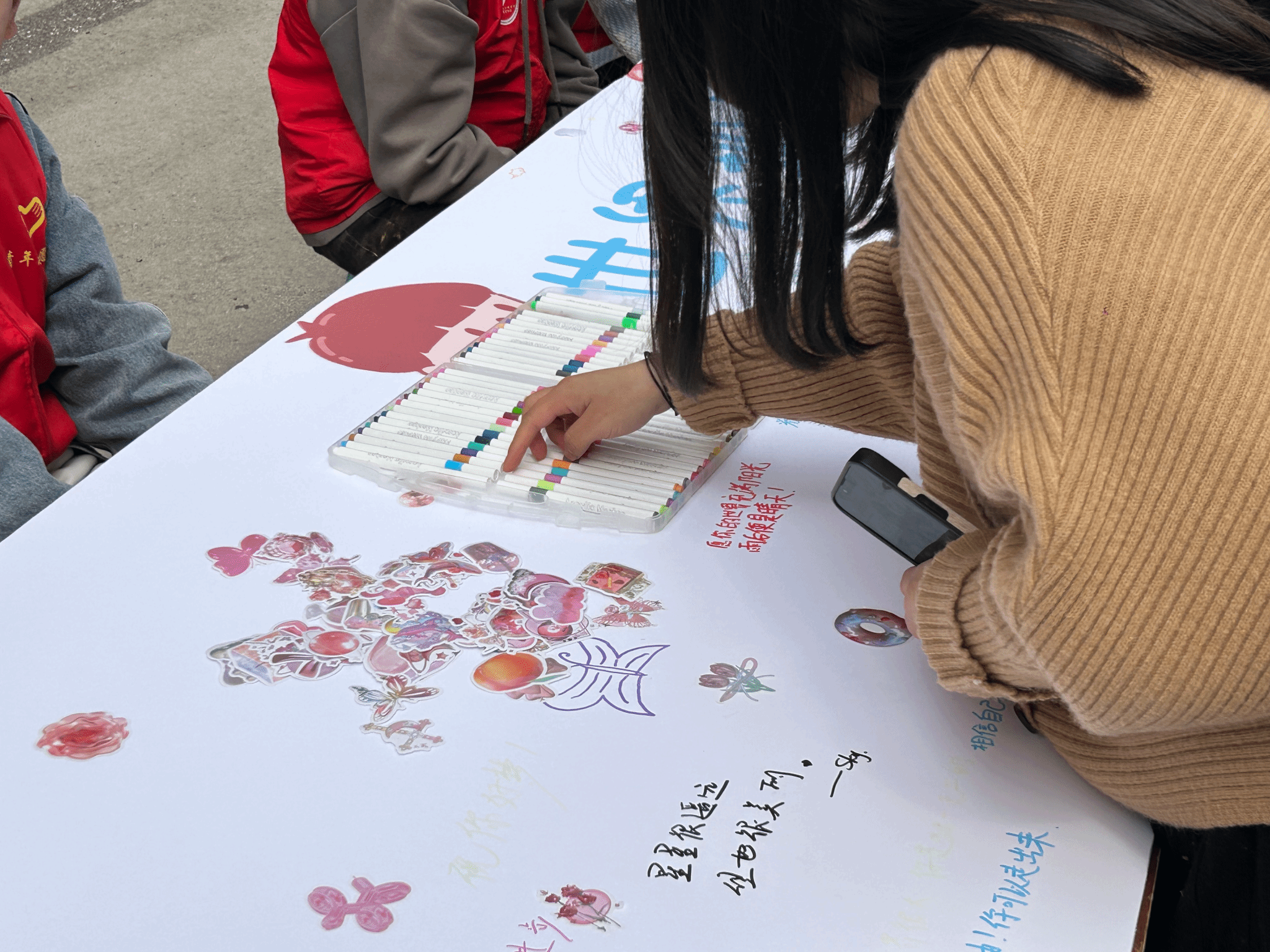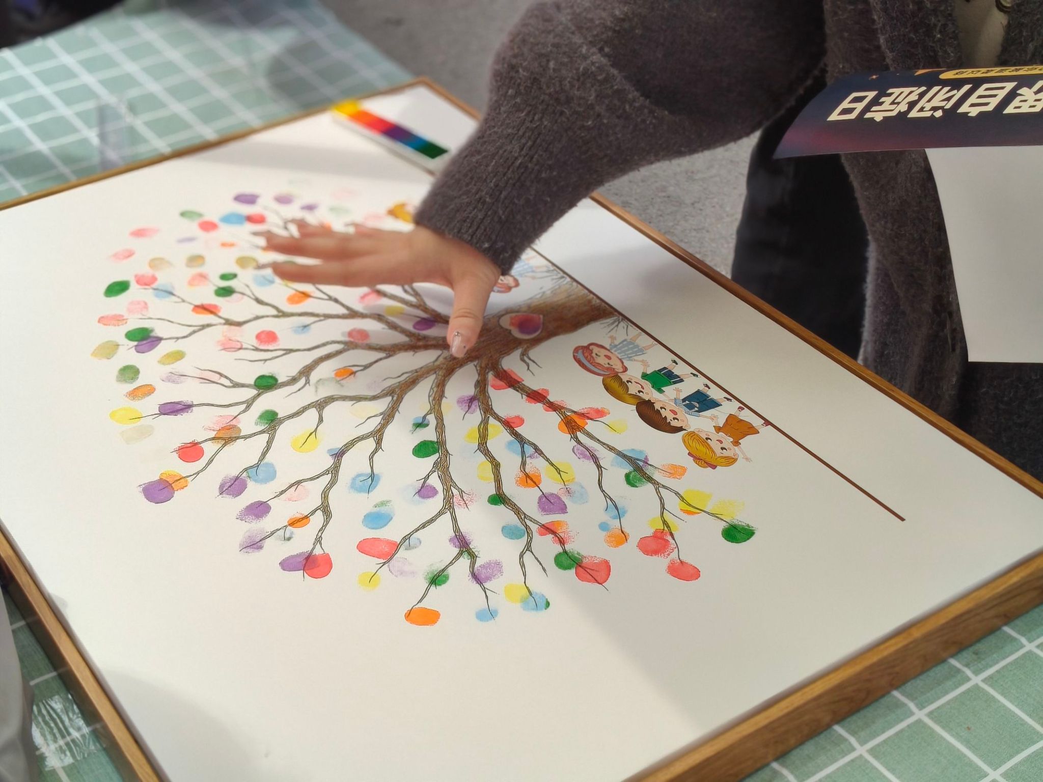 在各个精彩纷呈的活动环节里,同学们热情高涨,全身心地投入其中。来到“种下希望之树”的环节,大家围在摆放着彩泥的桌前,认真地挑选着自己心仪的颜色。随后,他们走到定制签名树前,或是郑重地按下自己的指纹,为这棵树留下独一无二的印记;或是充分发挥自己的创意,用彩泥创作出独特的图案,每一个印记、每一幅图案,都饱含着同学们对孤独症患者最美好的期望,希望他们能够早日康复,生活重新焕发出绚丽的光彩。