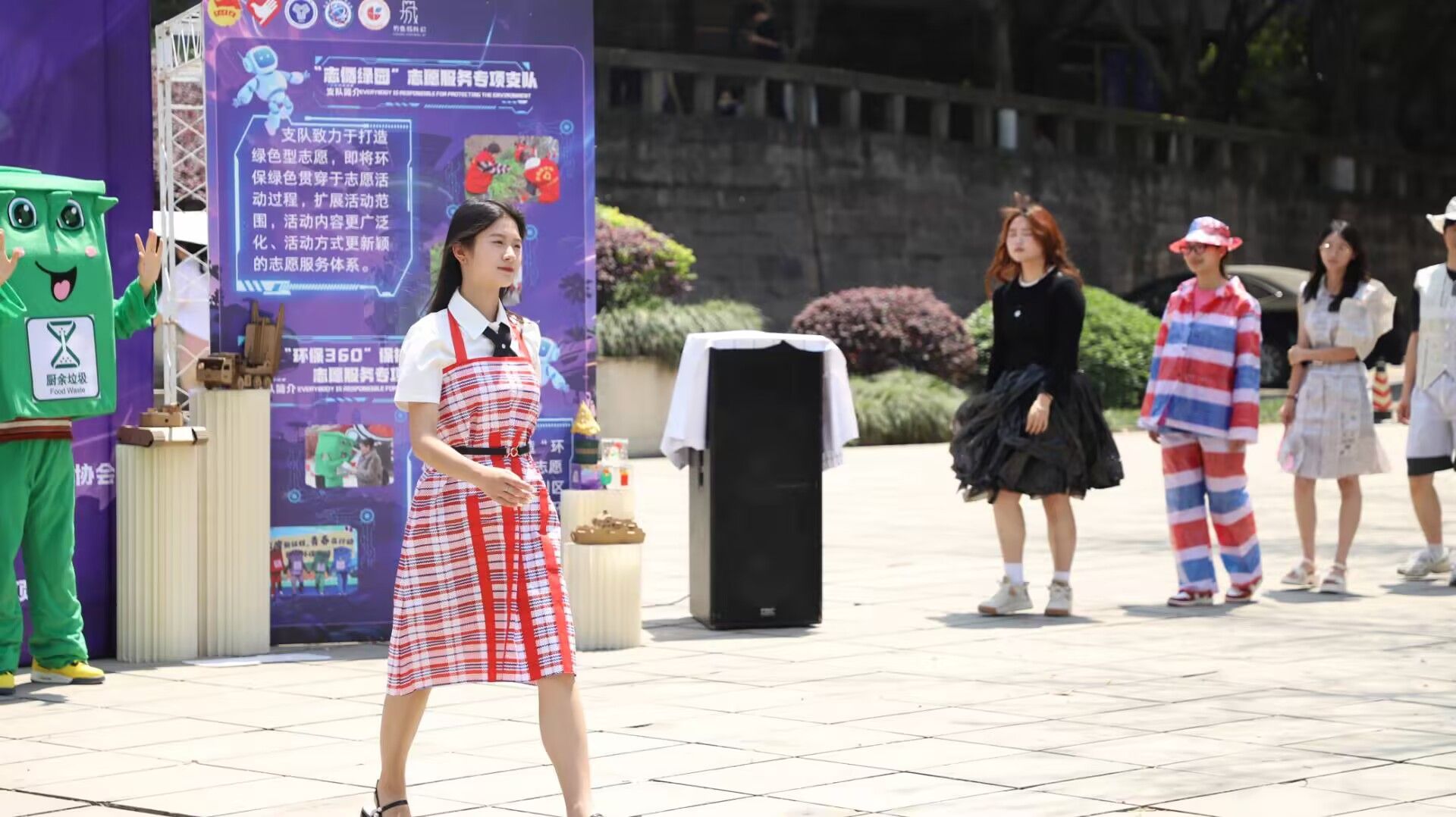 活动在别开生面的创意展示中拉开序幕。通信学院志愿者身着由废弃塑料瓶、旧衣物等材料制成的“环保创意服装”,将环保理念融入时尚设计,打造出一场艺术与生态交融的视觉盛宴。随后,“环保360”专项支队带来的“环保手势舞”以灵动整齐的动作传递“珍视自然、守护资源”的呼吁,指尖的律动化作环保宣言,点燃全场参与热情。