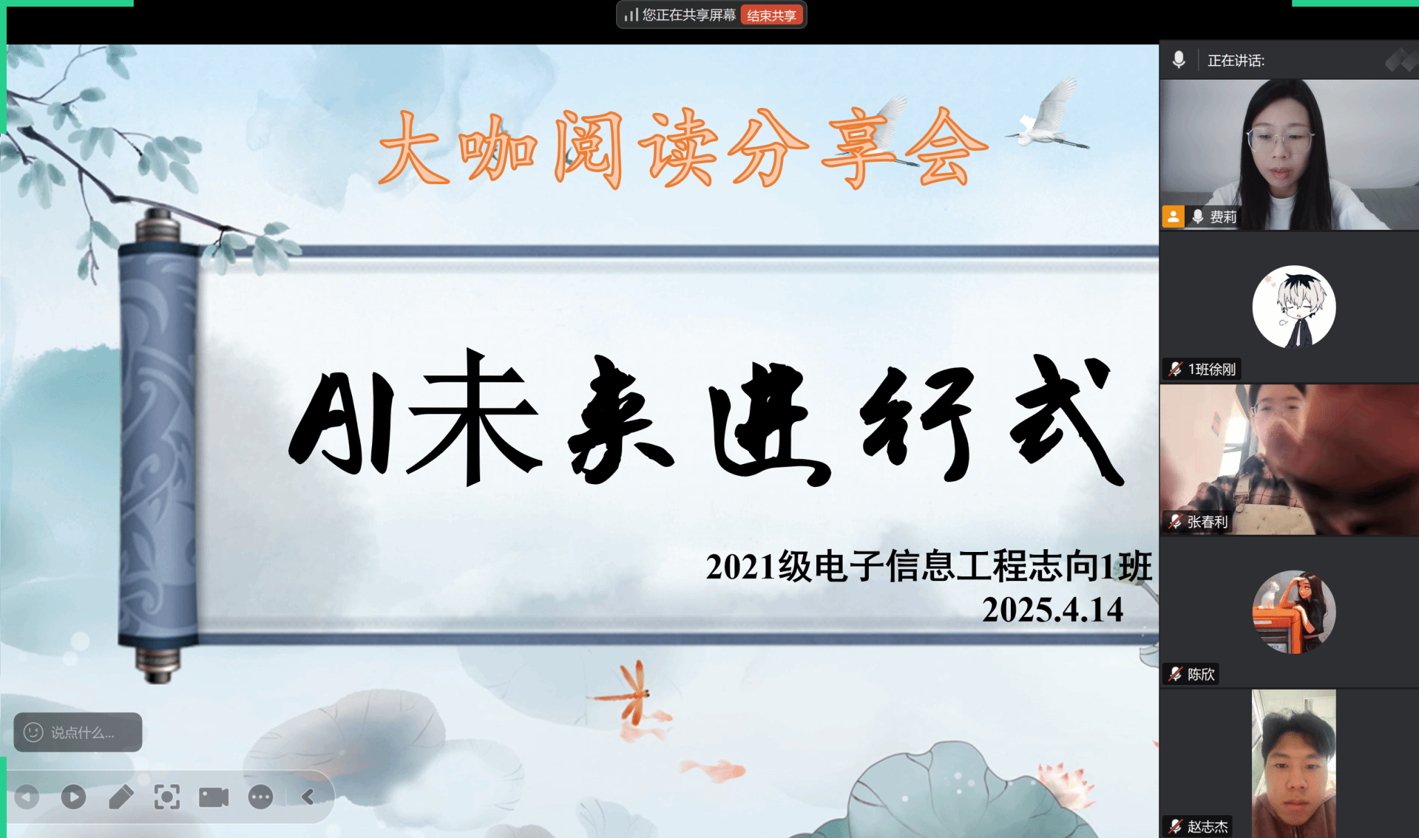 2025年4月14日下午4时,一场以“AI未来进行式”为主题的线上分享会通过腾讯会议举行。本次活动由费莉老师主持,她与五位学生代表共同探讨了人工智能(AI)的发展前景及其在当前社会中的应用,并结合“大咖阅读”中的经典人物案例展开深入分析。