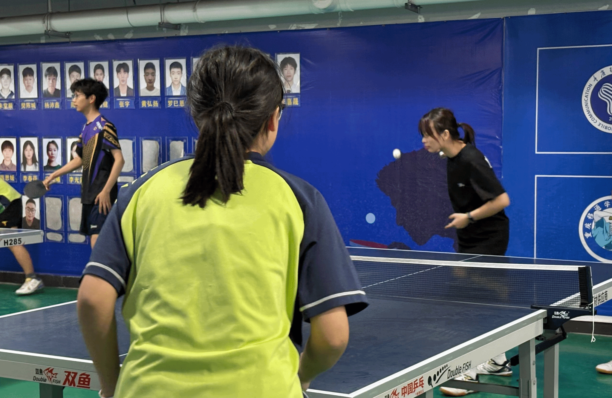 在移通学院乒乓球训练馆的多球对抗区,校队另一位队长杨银璐正带领队员进行摆速强化训练。这位通信与信息工程学院2022级学生,曾在2023年重庆市大学生乒乓球锦标赛中摘得混合双打季军,2024年又携女团成员再度跻身三甲。作为从青涩新生蜕变为团队核心的见证者,她将"每一板球都要当作赛点来打"的信念融入日常:无论是晨训时的正手暴冲专项练习,还是赛后为队员逐帧分析双打轮转换位战术,这位女队长始终践行着"辉煌由千百个训练球铸就"的座右铭。