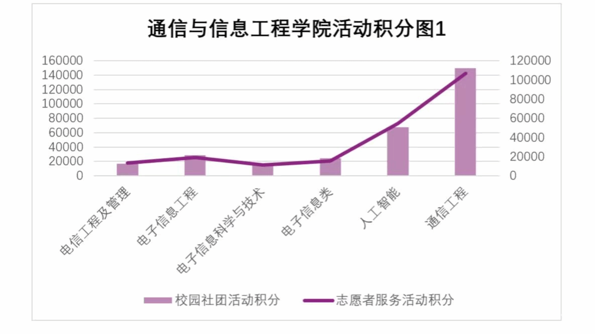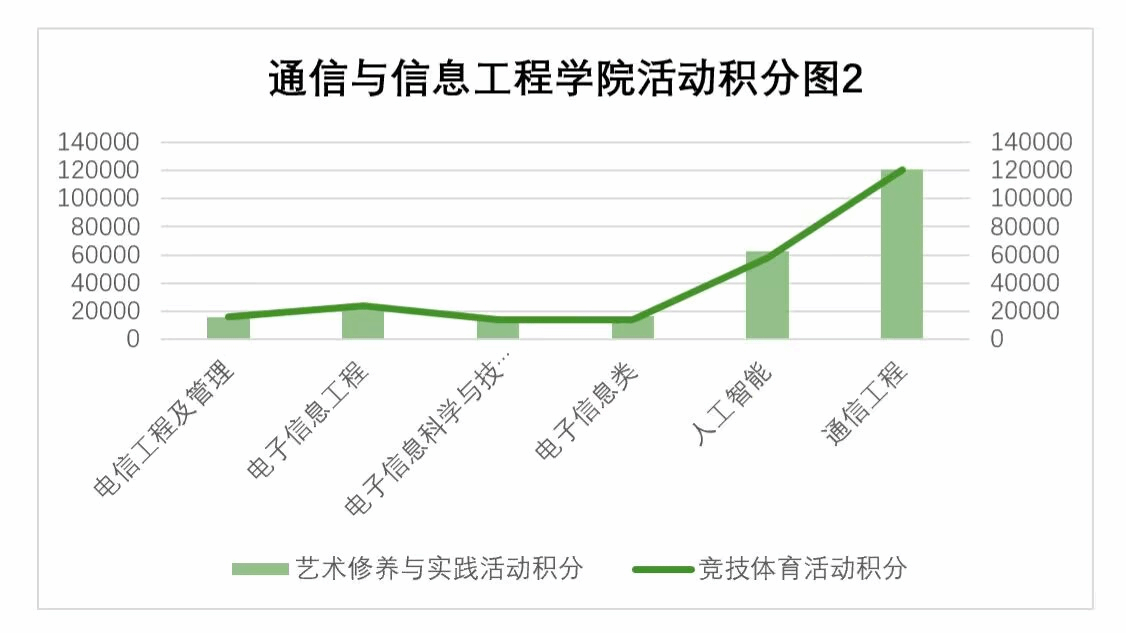 根据图表数据显示,通信与信息工程学院各专业学生在校园社团活动和志愿者服务活动中的参与情况呈现明显差异。其中,通信工程专业学生在校园社团活动中的表现尤为突出,积分总量超过140,000分,显著高于其他专业;而人工智能专业则在志愿者服务活动中表现优异。除通信工程专业外,其余各专业在这两类活动中的学分获取情况基本持平。而人工智能专业则展现出更强的志愿服务倾向,而其他专业在活动参与方面相对均衡。