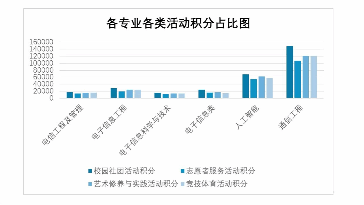 该柱状图展示了不同专业学生在各类活动中的积分占比情况。图中可见,通信工程与人工智能专业学子在完满教育活动中展现出极高的参与度,其综合积分也远超于其他专业。电信工程及管理、电子信息工程等专业的学生在各类活动中的积分分布较为均衡,但仍有提升空间。