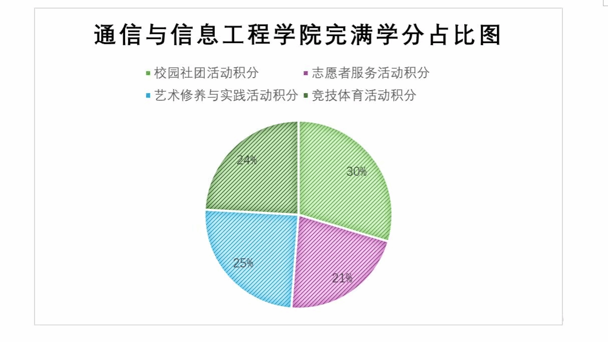 本月,通信与信息工程学院学生会对本院完满积分数据进行统计和分析。对通信与信息工程学院观察数据可知,校园社团活动、志愿者服务活动、艺术修养与实践活动以及竞技体育活动这四个方面,学生的积分占比相对平均。这一数据特征反映出学生能够科学合理地分配课余时间,在保持学业的同时,积极参与各类素质拓展活动。