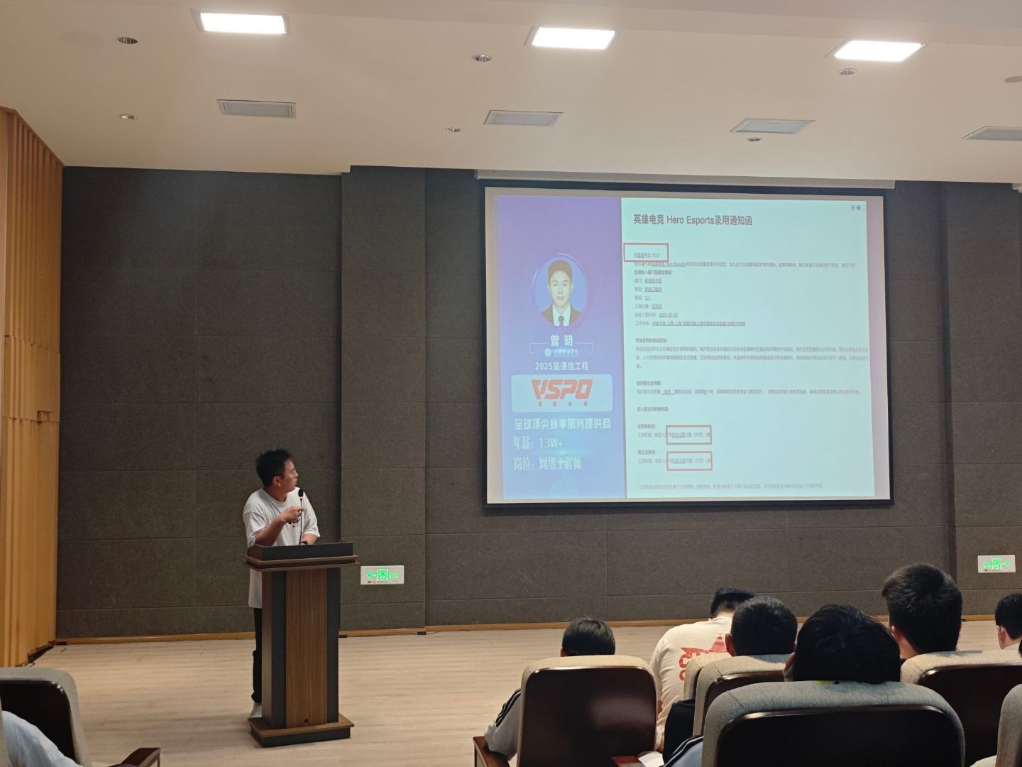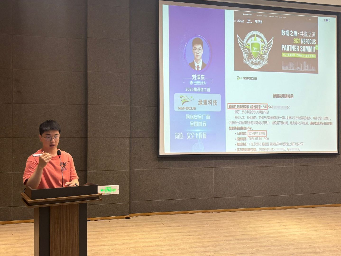 接着,刘洋庆学长给我们分享了他的四年大学生活。大一刚刚步入校园,学校的完满经历为他的未来做了铺垫,在大二时开始学习网络技术,于大三上学期参加比赛,通过不断地学习和积累,在大三下学期获得了绿盟科技实习的offer,在经历重重考验后最终成功入职。刘洋庆学长用脚踏实地的行动与不懈的努力,在大学四年里书写了属于自己的奋斗篇章,其经历也为同学们树立了追逐梦想、砥砺前行的榜样。