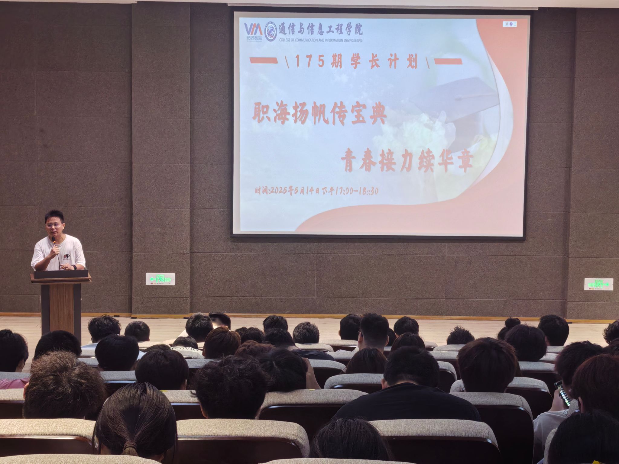 为切实助力学子们明晰职业发展路径,增强就业核心竞争力。通信与信息工程学院于2025年5月14日17:00在六度空间无限多功能厅举办了第175期学长计划之“职海扬帆传宝典,青春接力续华章”经验分享会。活动特邀2021级通信工程专业曾明、刘洋庆两位优秀学长作为主讲嘉宾,他们结合自身实习经历,分享技术实践、项目管理等实战经验,更以鲜活案例激励同学们将课堂理论转化为创新实践,在知行合一中为青春奋斗注入强劲动能。