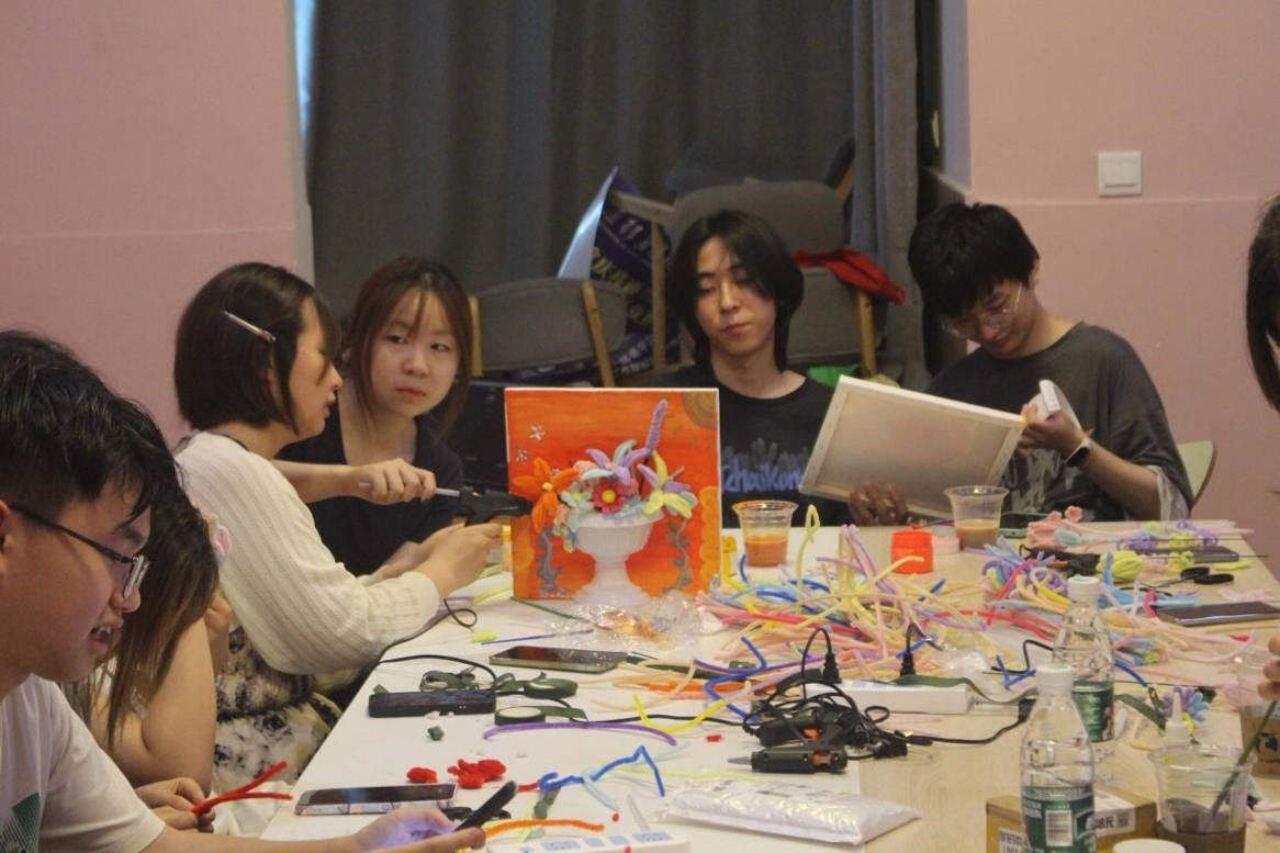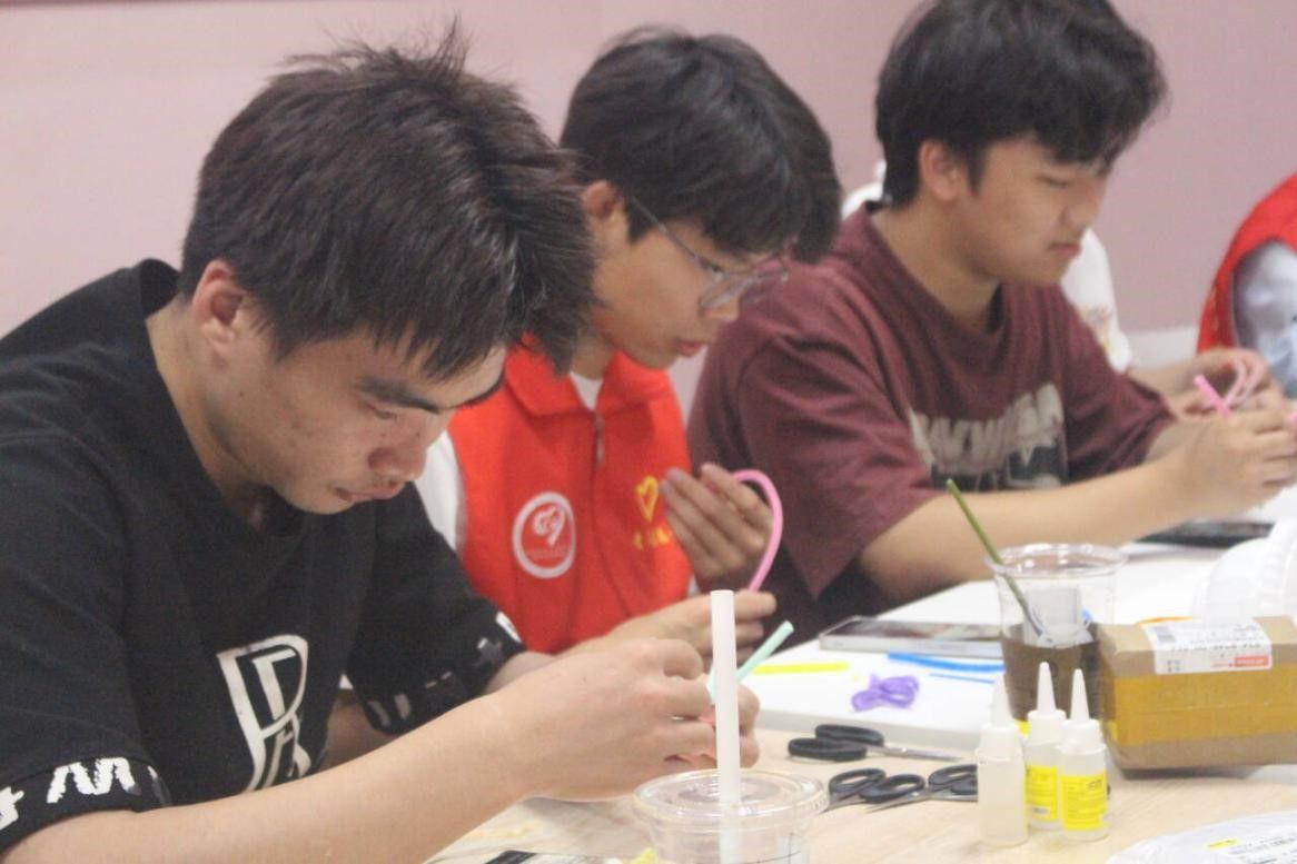 在志愿者现场演示环节,志愿者一边熟练地制作扭扭棒、进行插花,一边耐心讲解要点,对同学们提出的疑问一一解答。同学们认真聆听、仔细观察,迫不及待地想要动手创作。在自由组队环节,同学们迅速行动,在志愿者的协助下分工合作,充分发挥创意,将色彩、线条与手工技巧相结合,精心制作扭扭棒插花作品。大家相互交流、互相帮助,现场洋溢着浓厚的创作氛围。