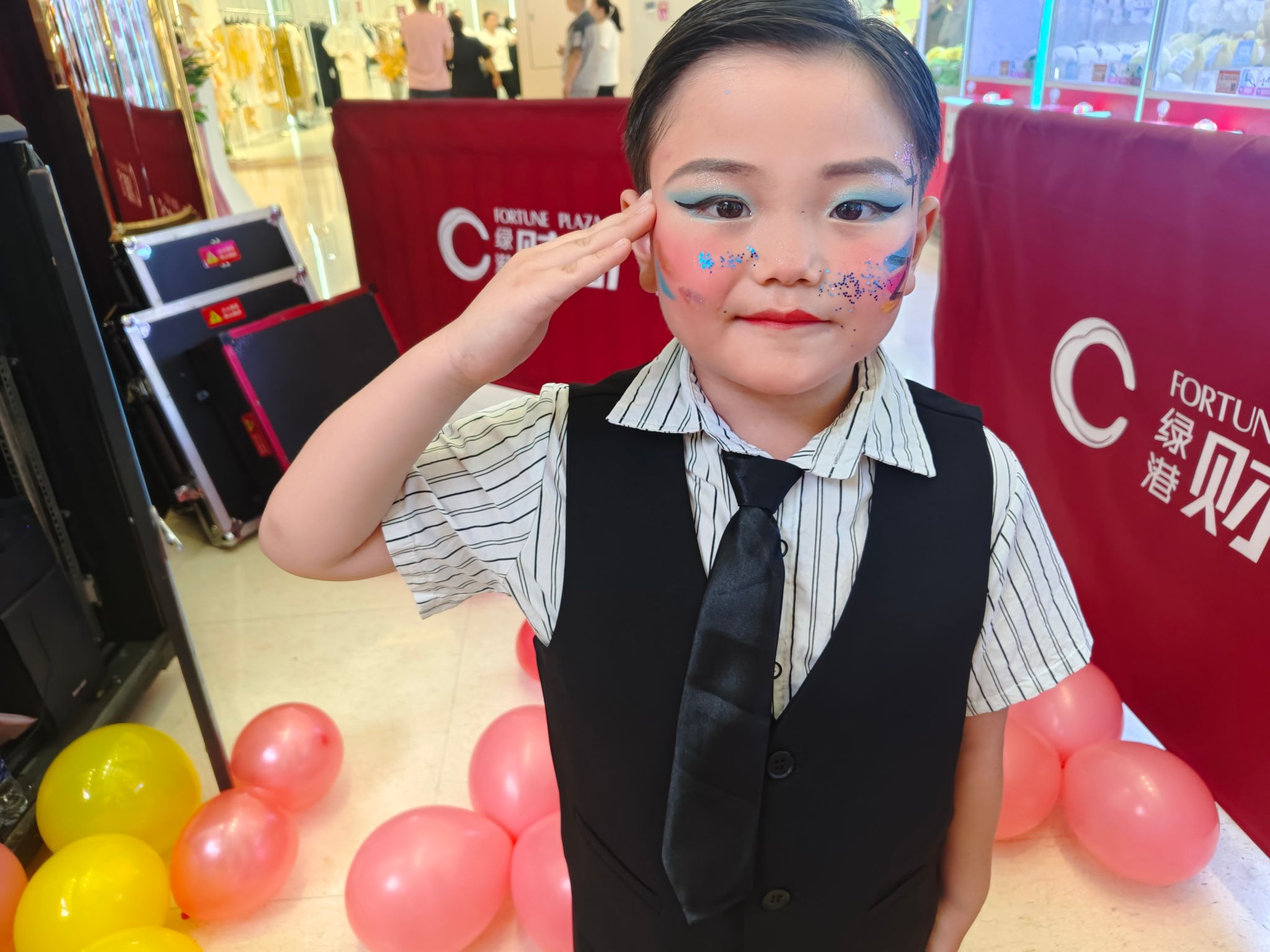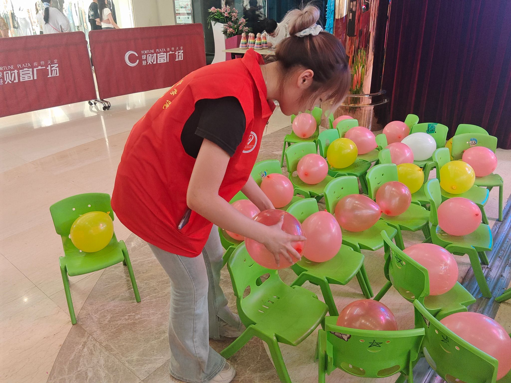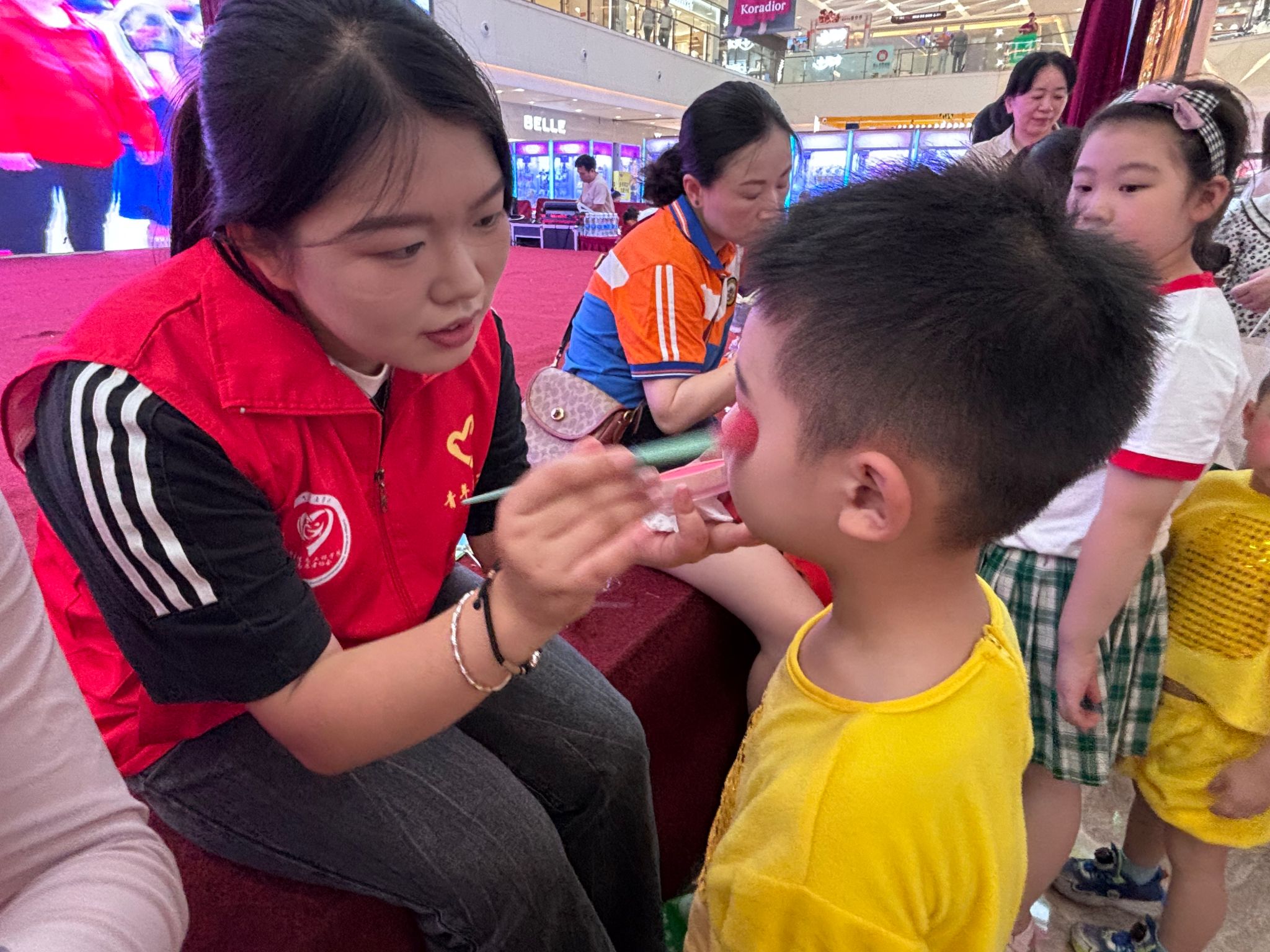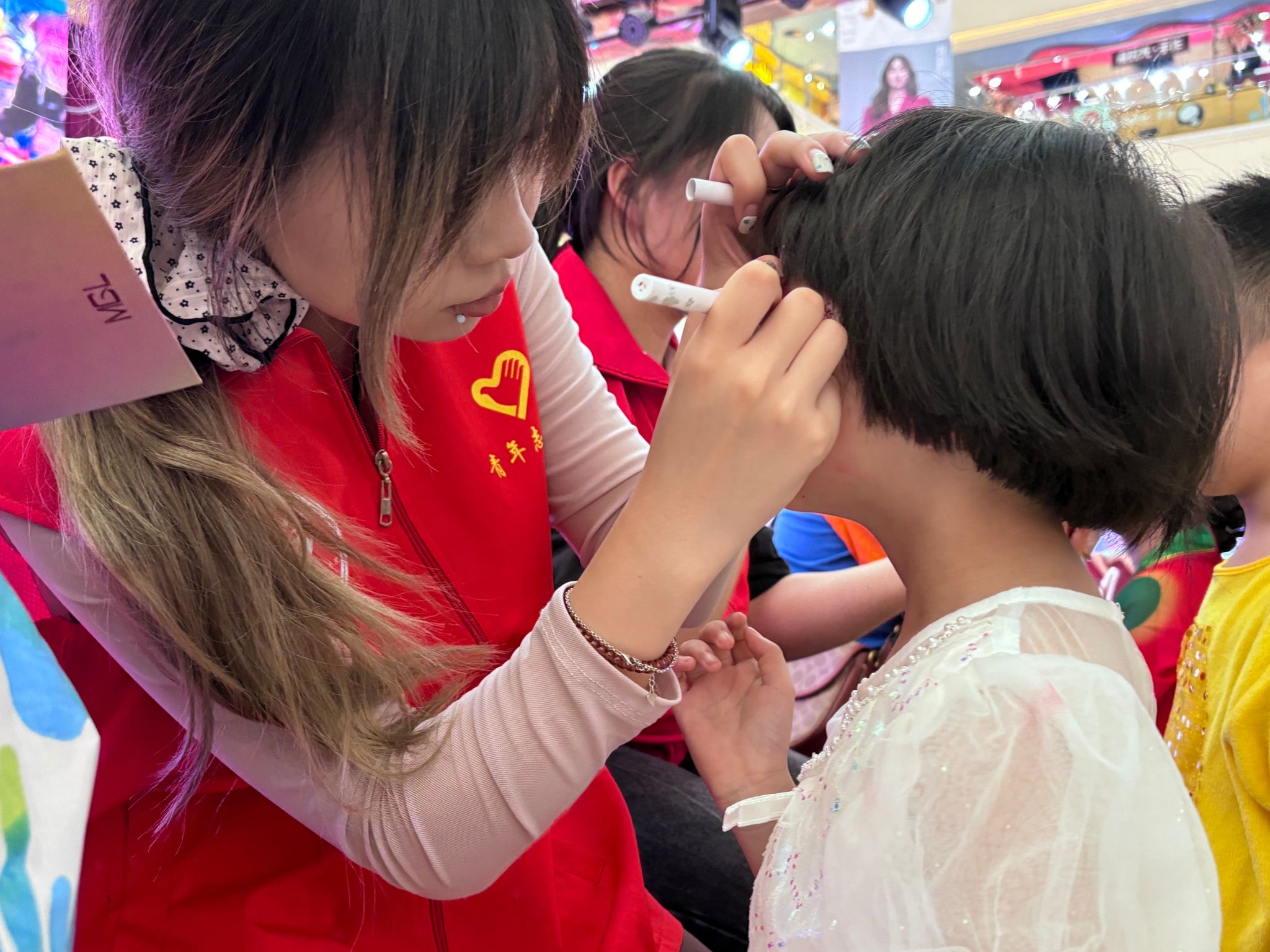 活动当天,志愿者们早早来到舞台场地,并迅速投入到工作中。大家分工明确,有的志愿者负责布置场地,将色彩斑斓的气球精心排列布置在舞台周围,为舞台增添活泼氛围;有的志愿者们化身“专业化妆师”。他们耐心地为每一位小朋友化着精致的妆容,根据表演节目类型,为古风节目的小朋友涂上自然的粉底,画上弯弯的柳叶眉;为表演嘻哈的小朋友打造帅气的妆容,勾勒出坚毅的眉形。志愿者们还不时和小朋友们聊天,缓解他们的紧张情绪,让小朋友们在轻松愉快的氛围中完成妆容打造。看着镜子里美美的自己,小朋友们开心得手舞足蹈,脸上洋溢着灿烂的笑容。