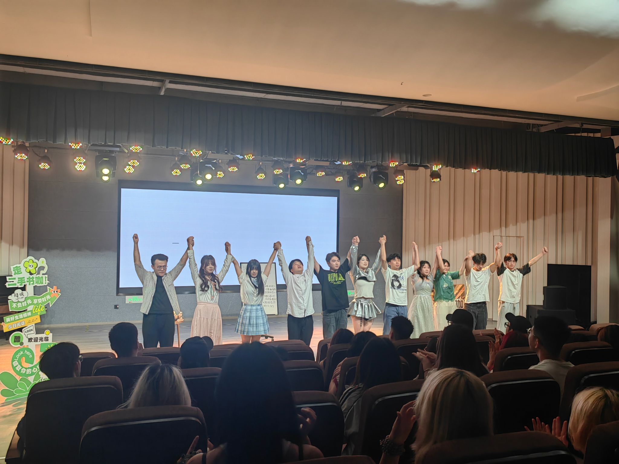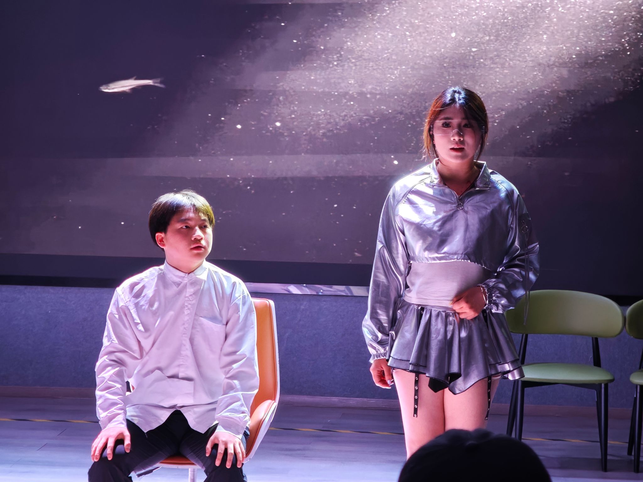 25日晚上七点,《以AI之名》剧组已然严阵以待。眼中眸光闪烁,交织着激动与紧张。当灯光悠悠亮起,黄佳宇同学饰演的伯醇似乎从纸张中活了过来;廖子乐“妈妈”好像也有了母亲的慈爱;AI作弊器似乎真的成为了“人生直通车”。他们以精湛的演技,将戏剧独特魅力娓娓道来,每一次自然流畅的对话,都映照着彼此间合作的无间默契。