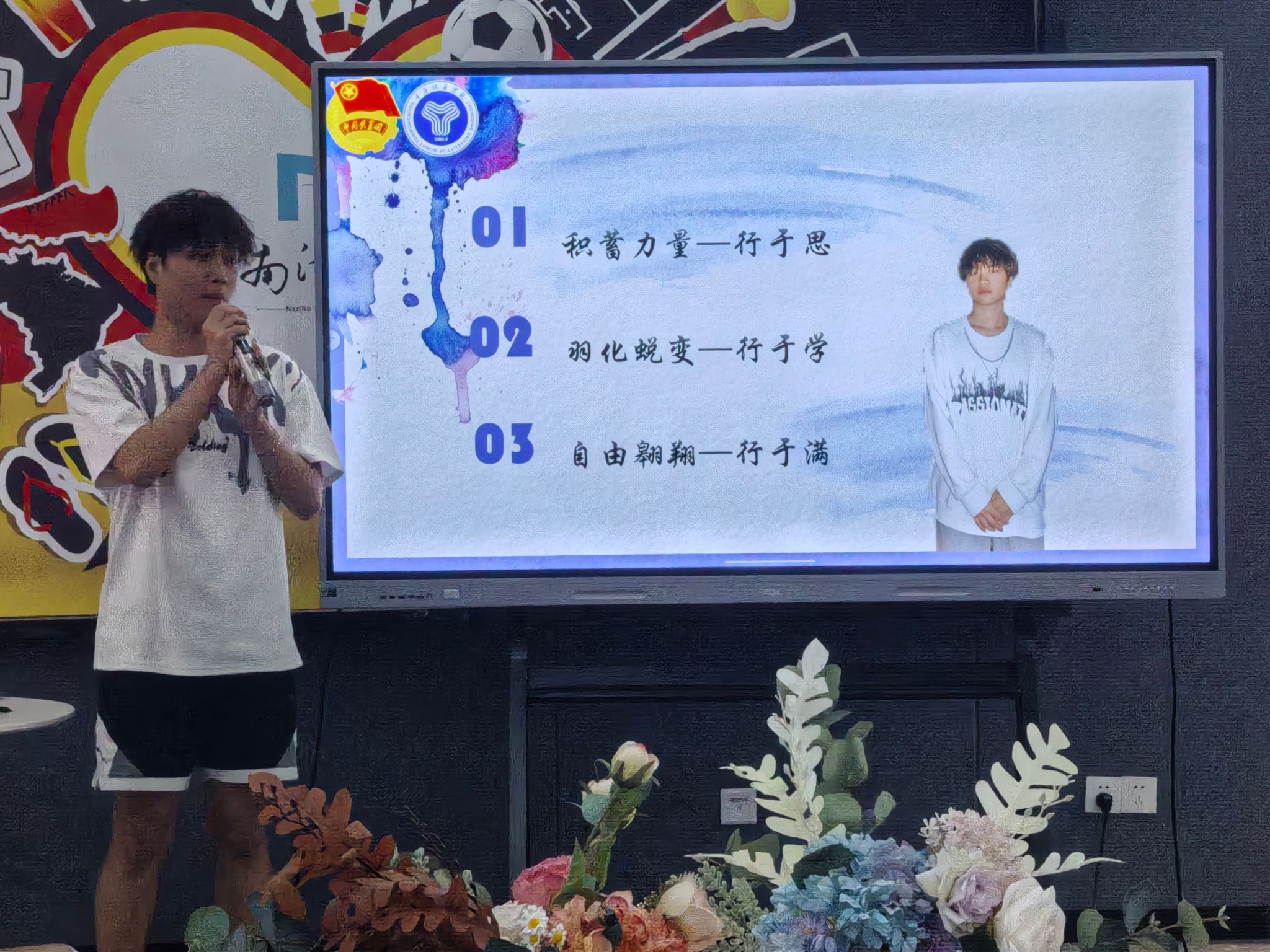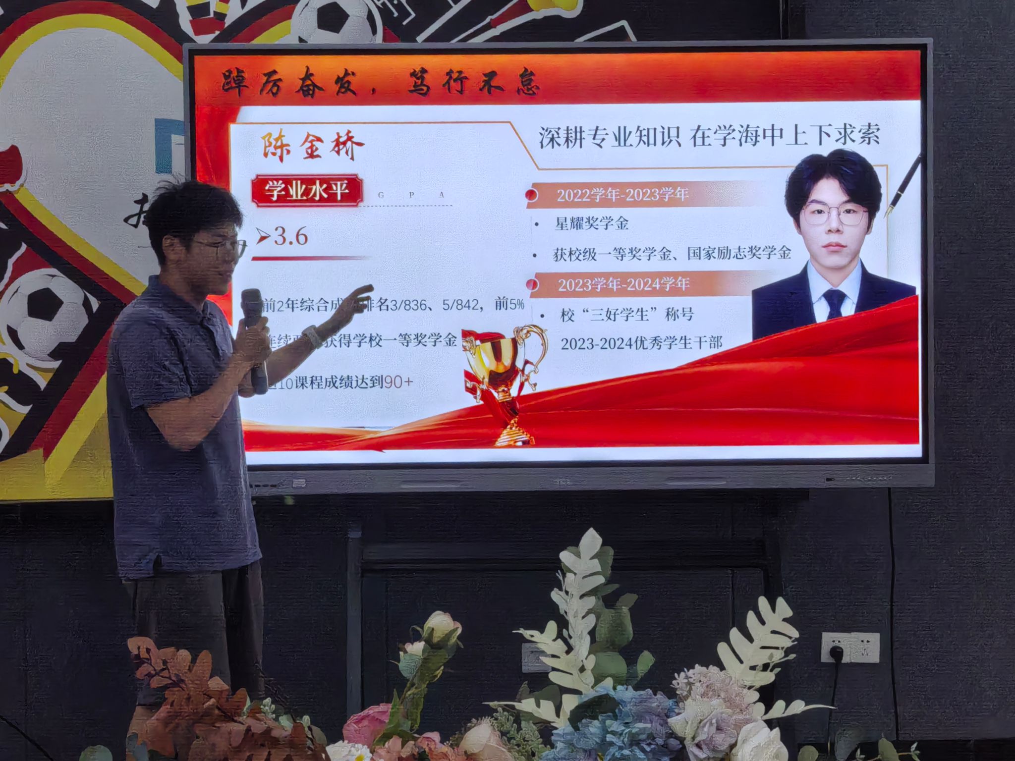 在经验分享环节,陈金桥学长首先回顾了其从普通学生到名列前茅的成长历程。他详细介绍了大一至大三期间,如何通过积极参与各类课外活动,科学规划并有效提升完满学分的实践经验。陈学长结合自身经历,系统分享了提升学业成绩与综合素质测评成绩的有效方法与策略。