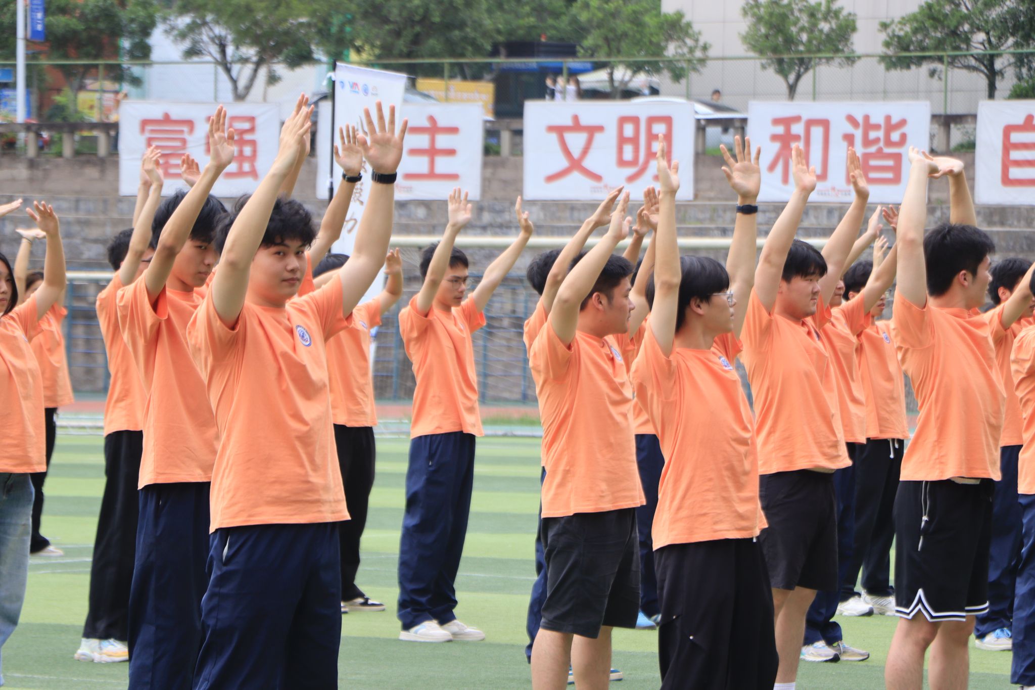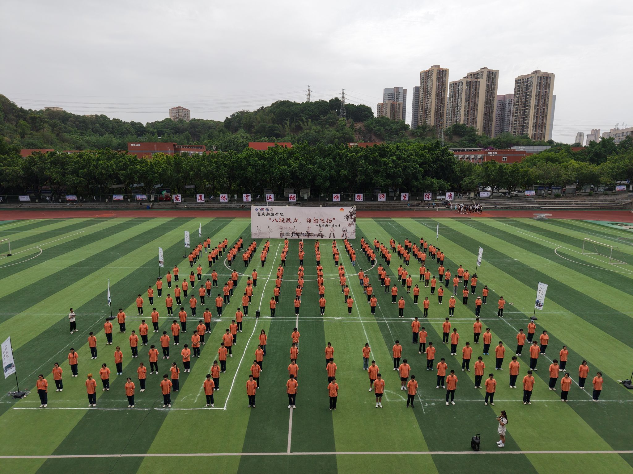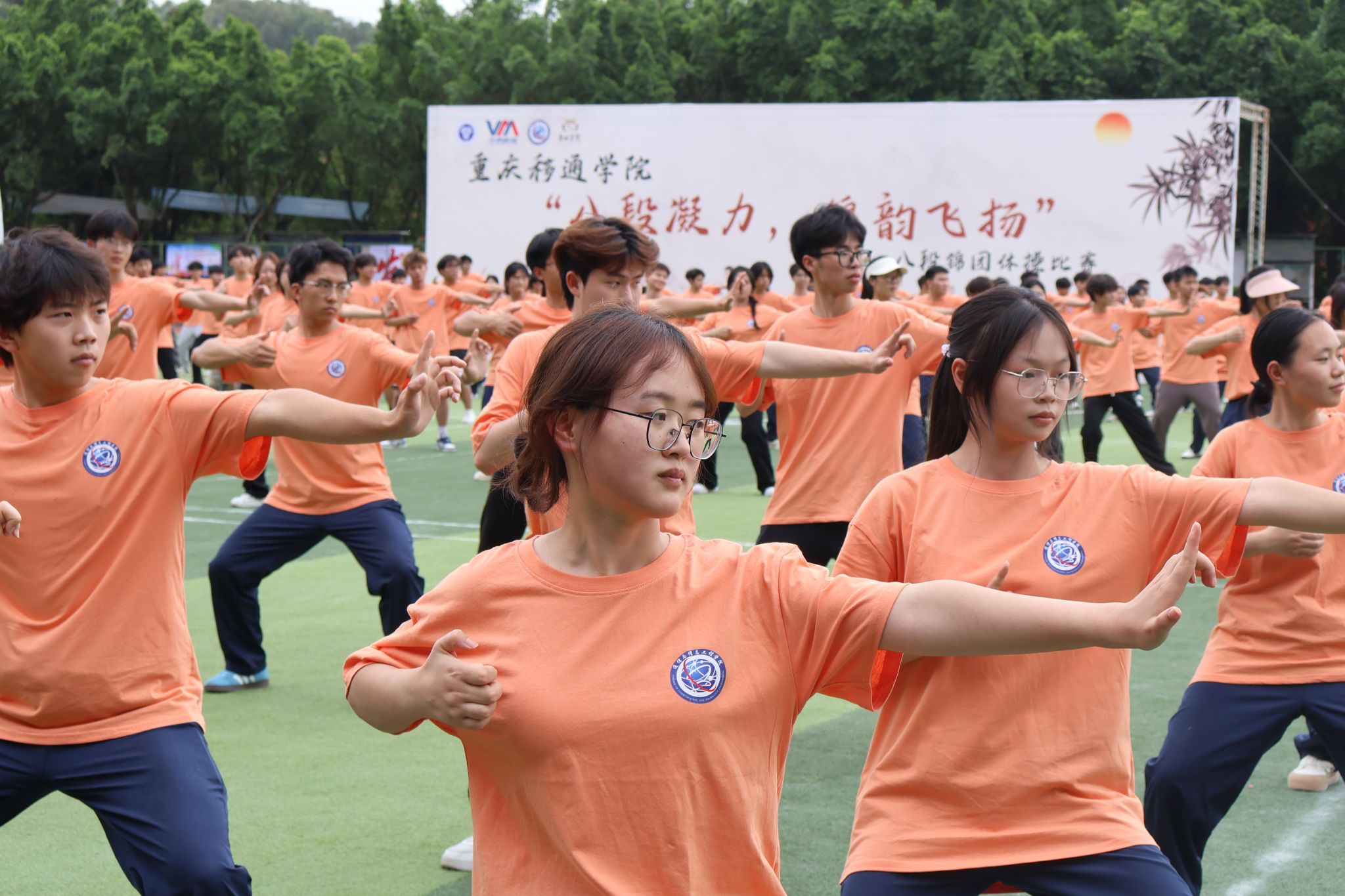 2025 年 5 月 23日,重庆移通学院迎来一场融合青春活力与传统文化的盛宴 ——“八段凝力,锦韵飞扬” 团体操八段锦比赛在学校大操场精彩上演。本次比赛由校竞技体育中心主办,吸引了9支班级队伍、共计 300余名学生踊跃参与。选手们以整齐划一的动作、蓬勃向上的精神风貌,为现场观众呈现了一场美轮美奂的视觉与文化双重盛宴。