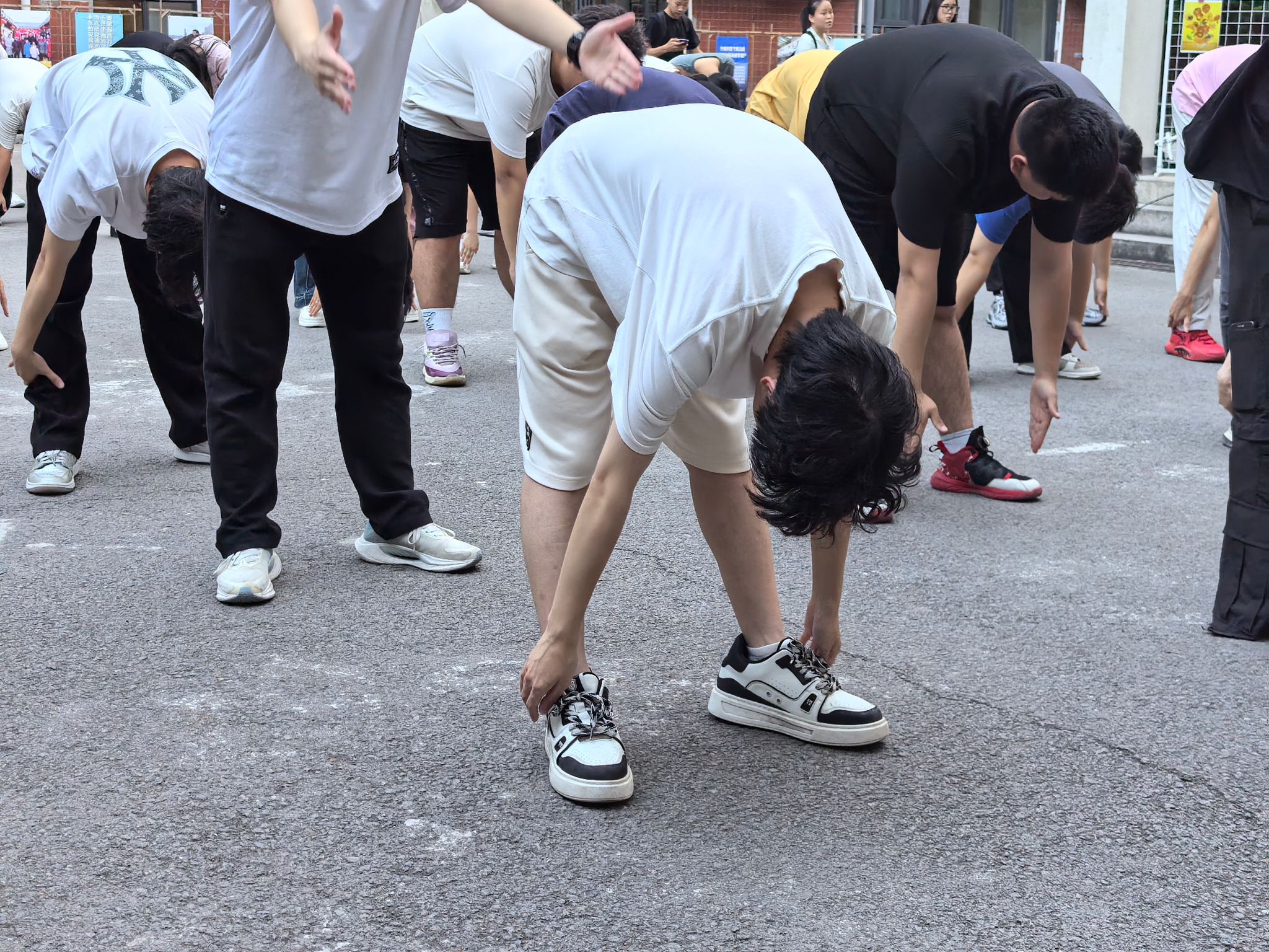 随着古筝曲《云水禅心》的悠扬旋律响起, “两手托天理三焦……”队员们动作如行云流水,起势含蓄沉稳,托掌时臂若伸枝,按掌似扎根大地。舒展的 “调理脾胃须单举”、刚柔并济的 “五劳七伤向后瞧”,一招一式精准契合八段锦 “意动形随、气沉丹田” 的精髓。阳光洒在队员们舒展的肩背上,衣袂轻扬间,传统养生功法的典雅气韵与当代青年的蓬勃朝气完美交融。