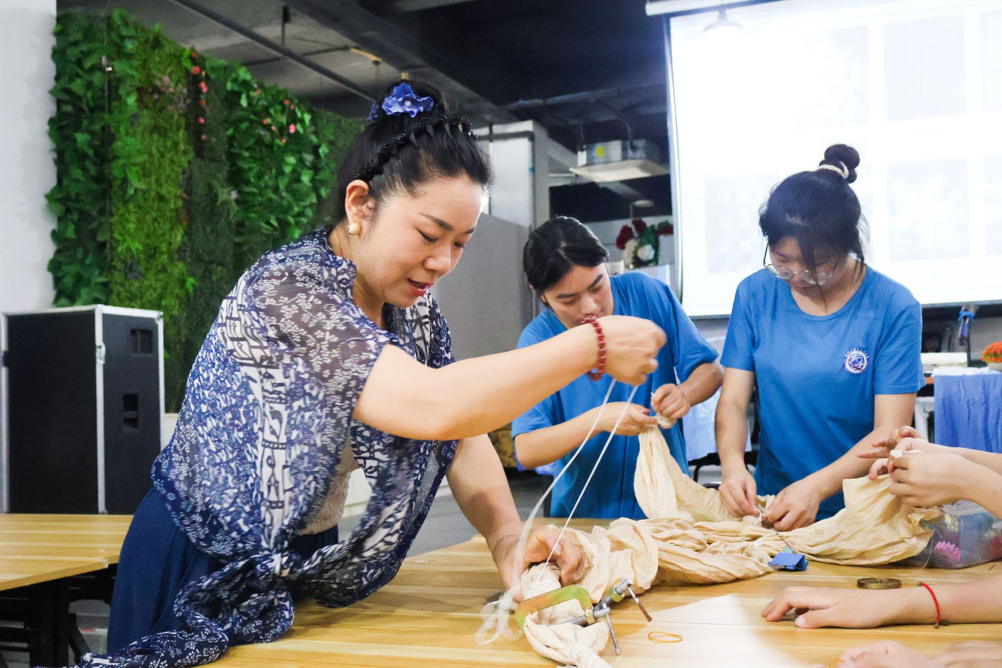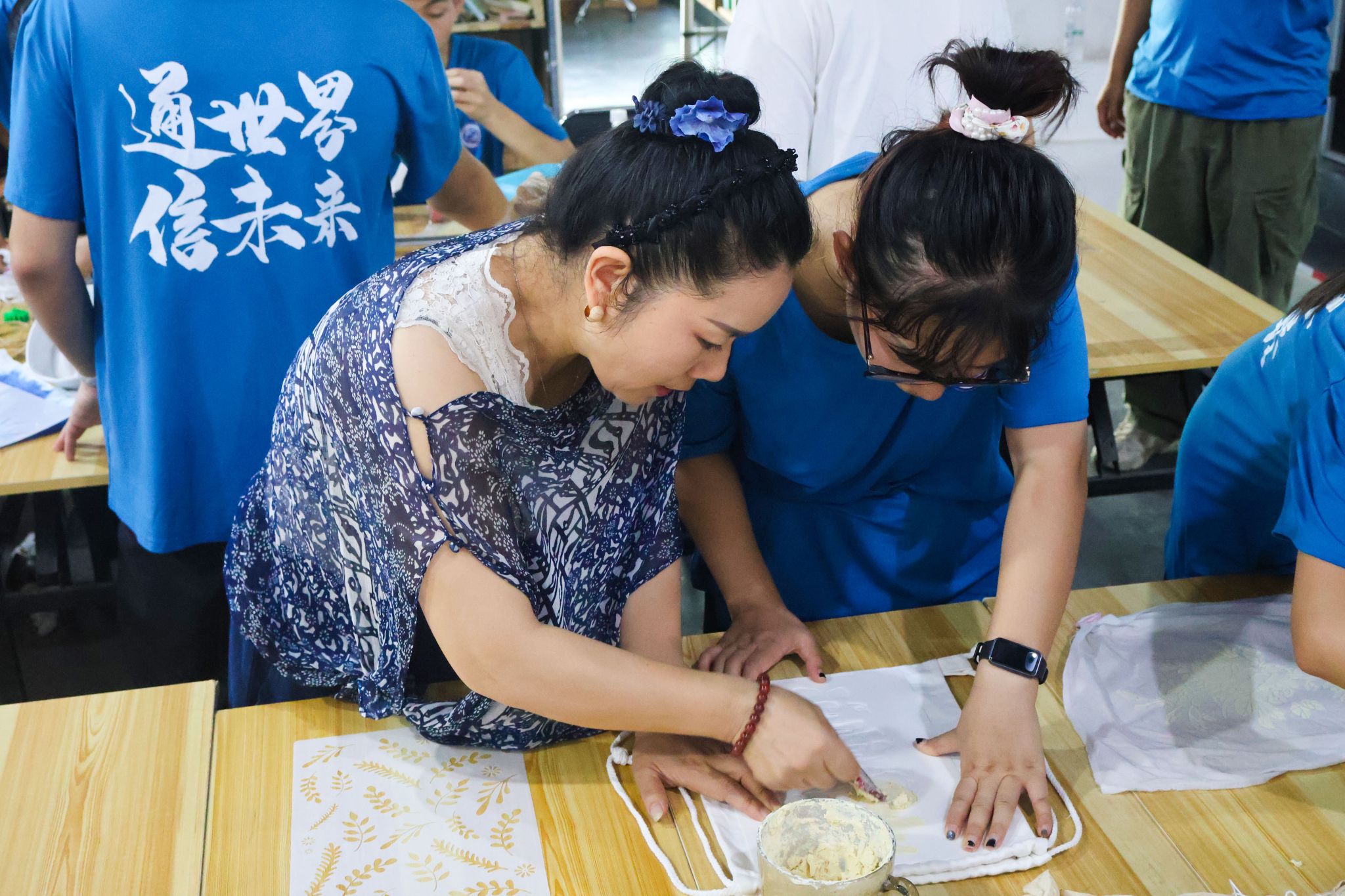 下午队员们来到忠州创业谷,在县级非遗传承人戈小红老师的指导下,系统学习扎染制作流程。从板蓝根植物染料的发酵工艺,到"扎、浸、染、晾"四大核心技法,传承人结合世代相传的经验,为队员们揭开扎染技艺的神秘面纱。在实践环节,队员们运用绞缬、夹缬等传统技法,将布料通过折叠、捆扎、缝合等方式塑形,再经过多次浸染、氧化,一件件独具匠心的蓝白作品逐渐成型。在这里,队员们不仅能学到坚实的扎染本领,更能感受到非遗文化背后深厚的精神内涵。