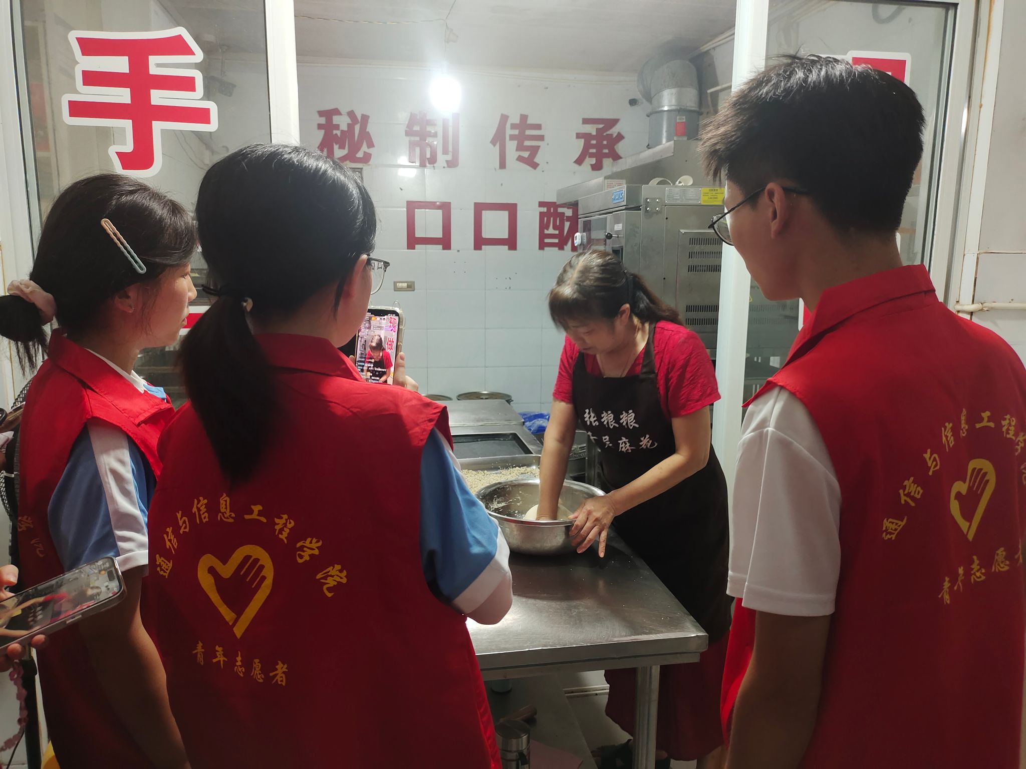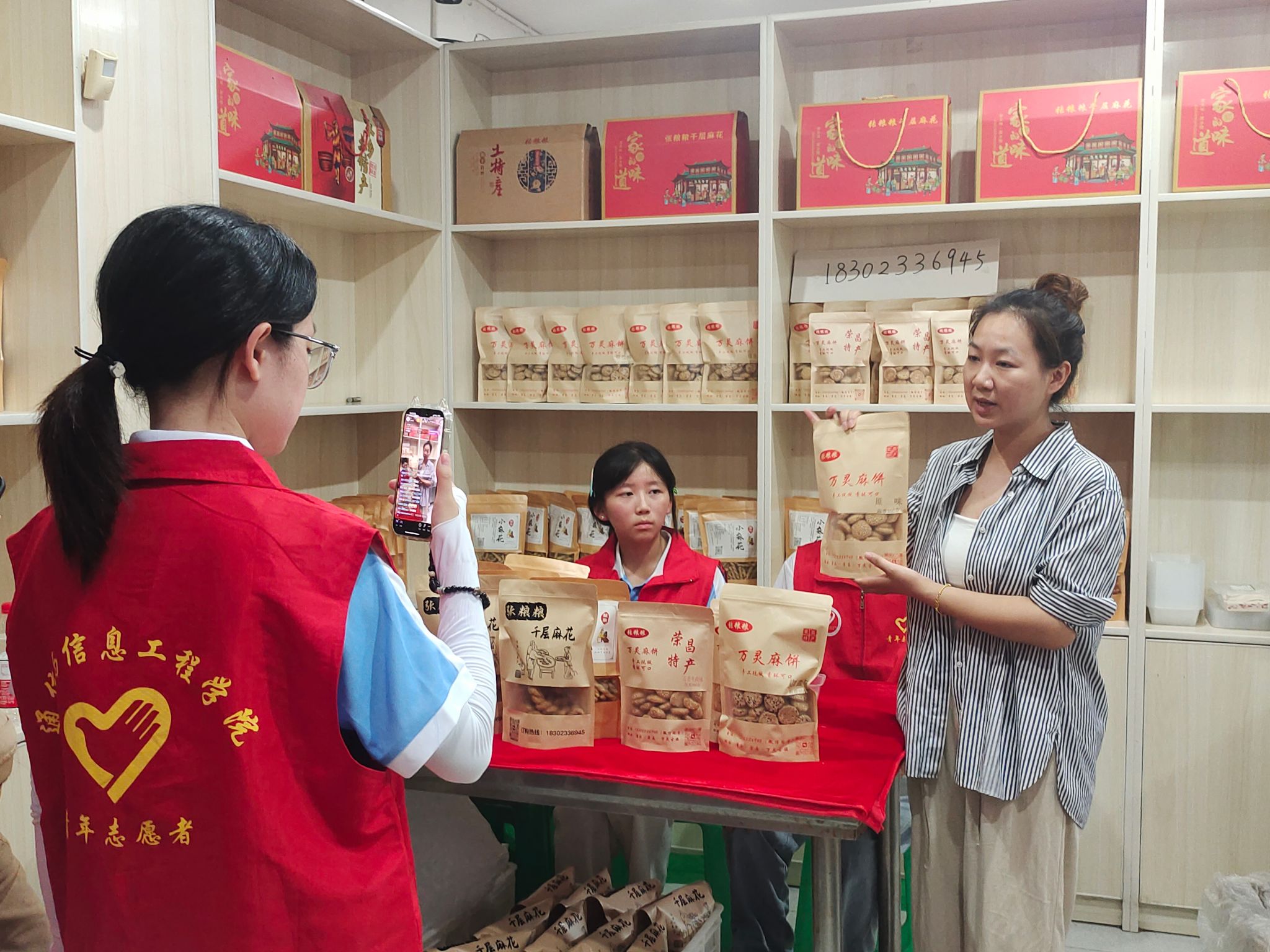 结束一天的庭院美化工作后,团队成员迅速转战古镇张嬢嬢的小店,开启非遗特产直播销售。直播过程中,成员们现场品尝麻饼,向观众展示产品酥脆口感,并详细拆解包装流程,展示生产工艺与品质把控细节。为扩大宣传效果,团队采取线上线下联动模式:抖音直播间实时与观众互动,解答产品相关问题;店门口设置试吃摊位,吸引过往行人品尝体验。此次直播活动累计收获3.7万点赞,吸引超900人观看;线下试吃摊位实现销售额300余元,成功实现线上线下销售双丰收。