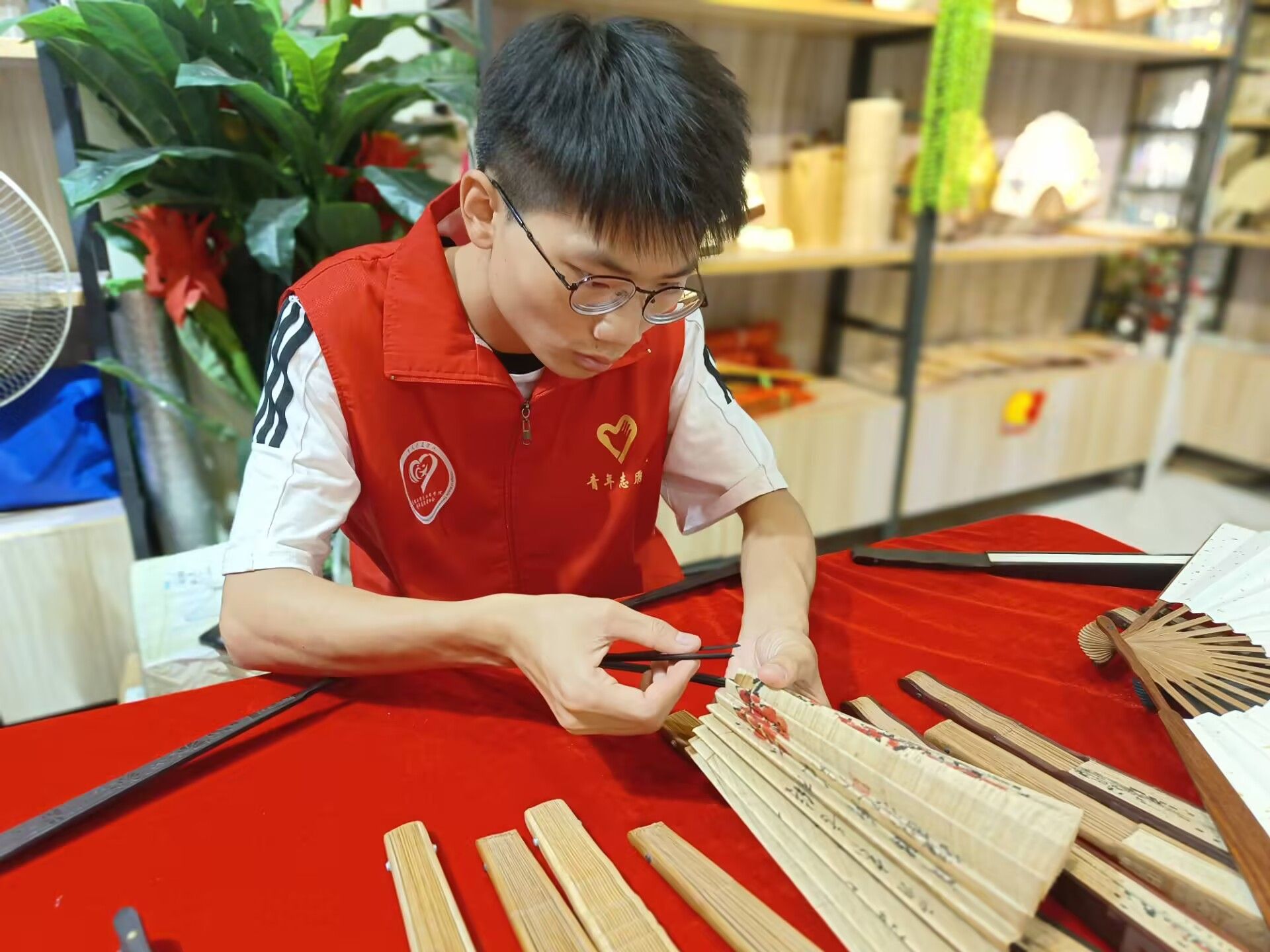“这布透气耐磨,是咱荣昌的特色。”赵老师说,夏布织好后要先浆洗定型,再绷到扇骨上,最后由画师根据扇面大小创作。队员们试着将扇骨插入夏布边缘的缝隙,才发现看似简单的步骤,稍不注意就会扯破布料,“光是这道工序,就得练三个月才能熟练。”