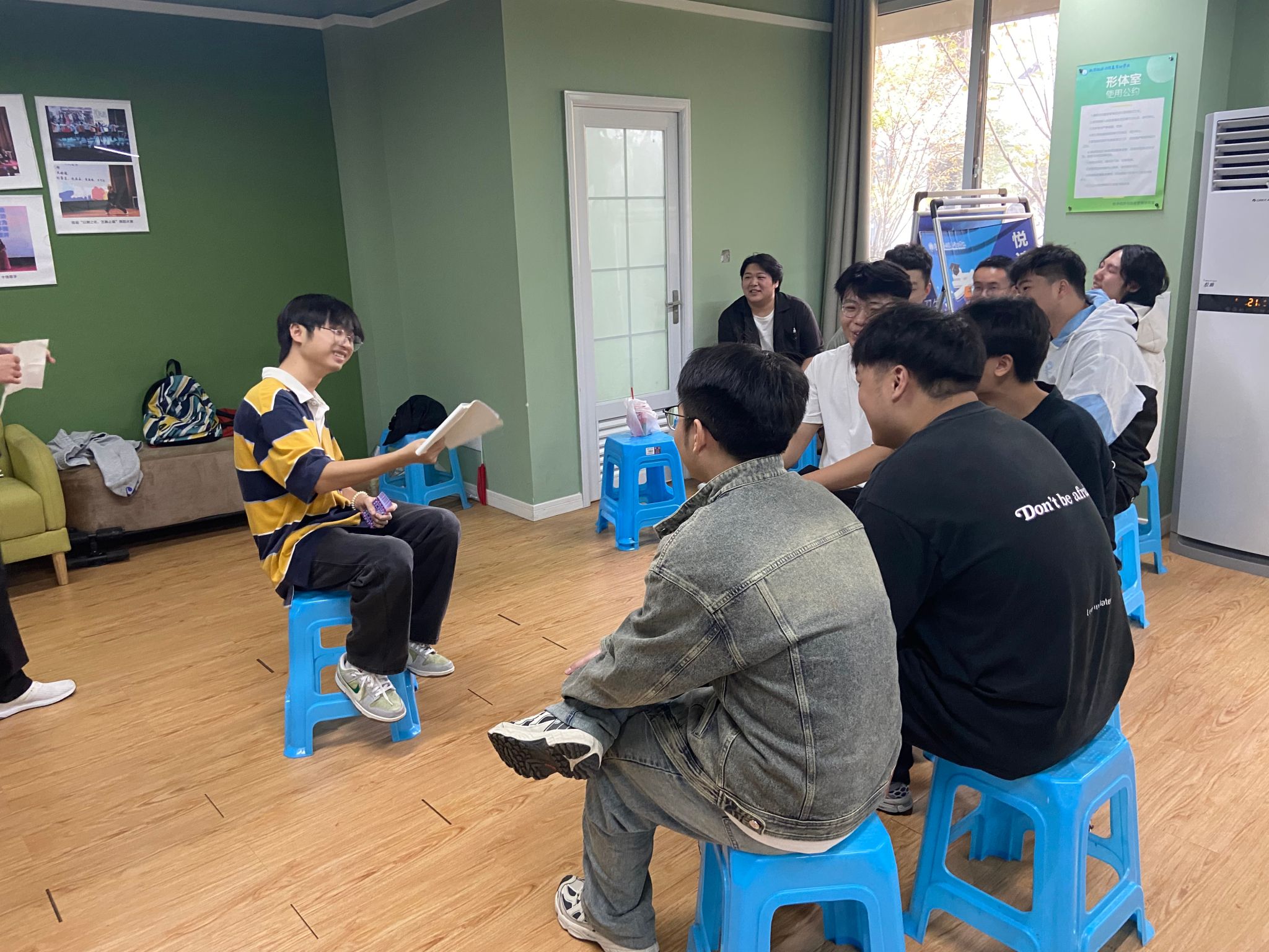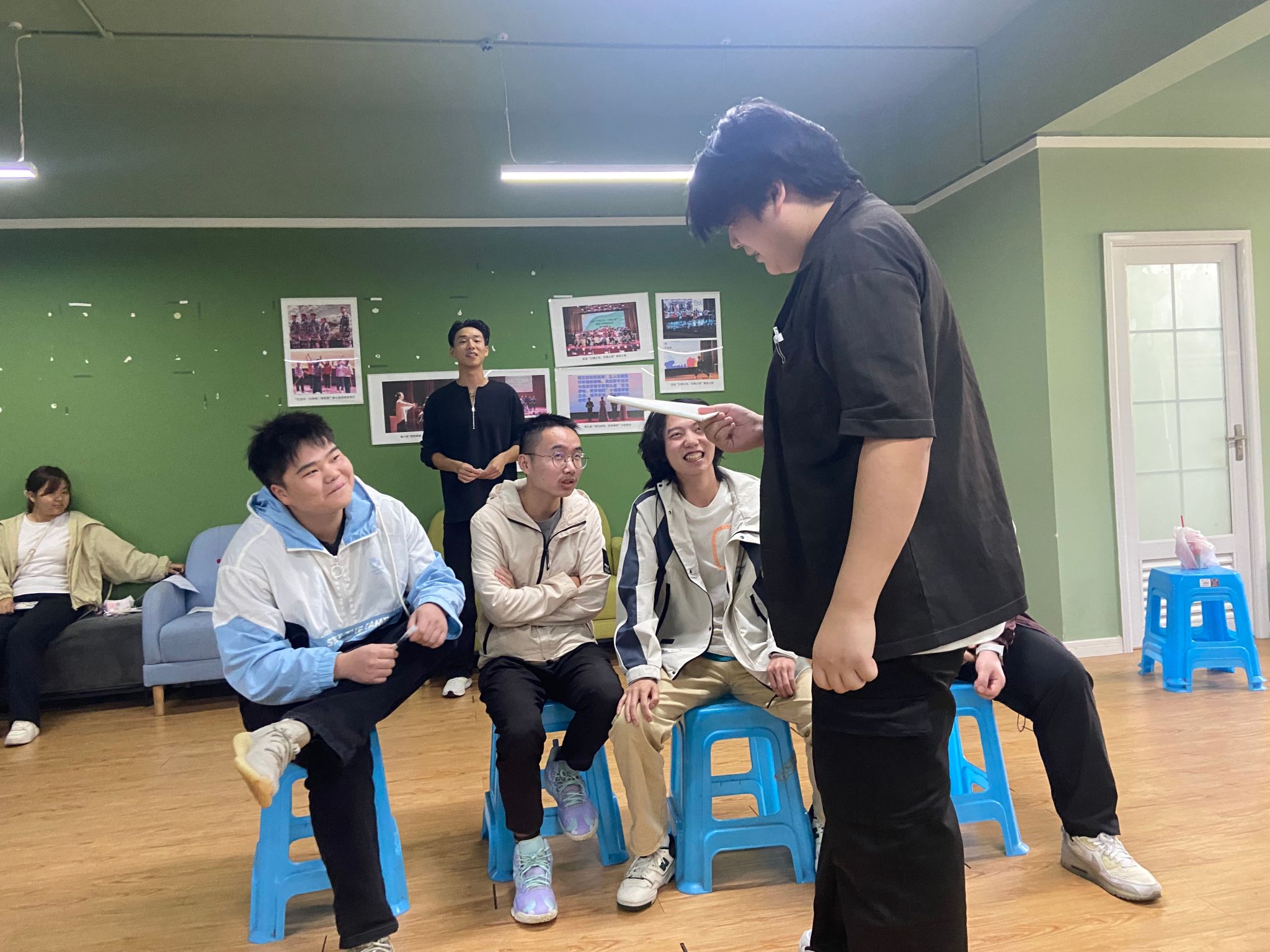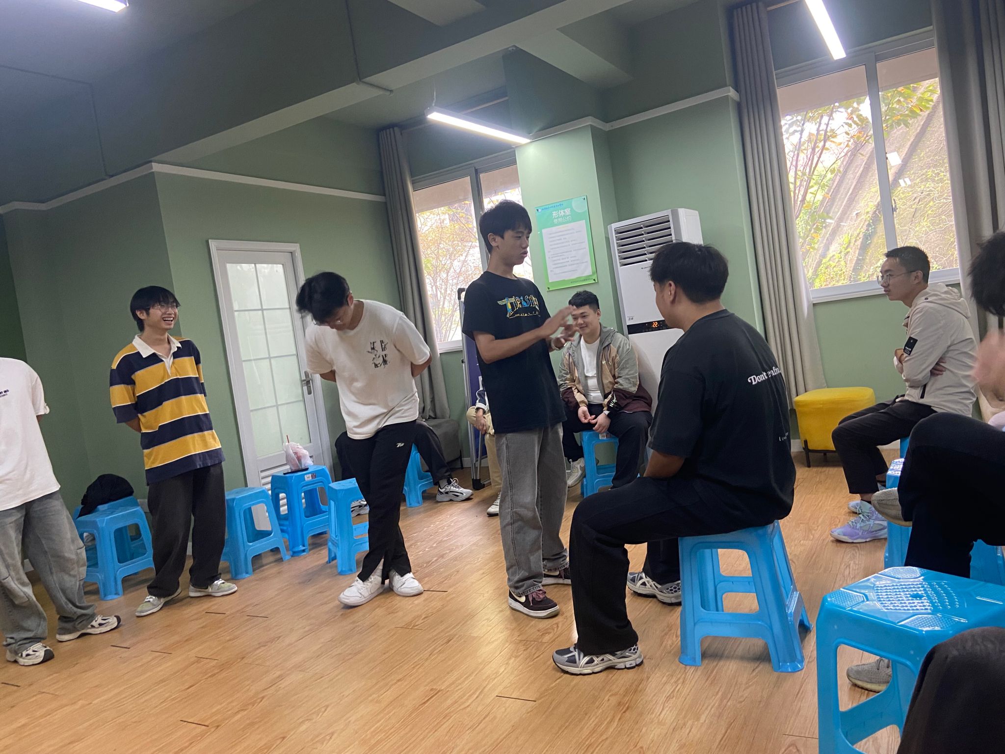 首个游戏“动作传声筒”率先点燃热情。全班被分为4组,每组第一位同学看完随机抽取的词语后,需通过肢体动作传递给下一位,依次接力直至最后一人猜出答案。过程中,因动作传递偏差闹出的“小乌龙”,反而让原本陌生的同学逐渐放下羞涩,主动交流调整动作,团队默契在笑声中悄然滋生。