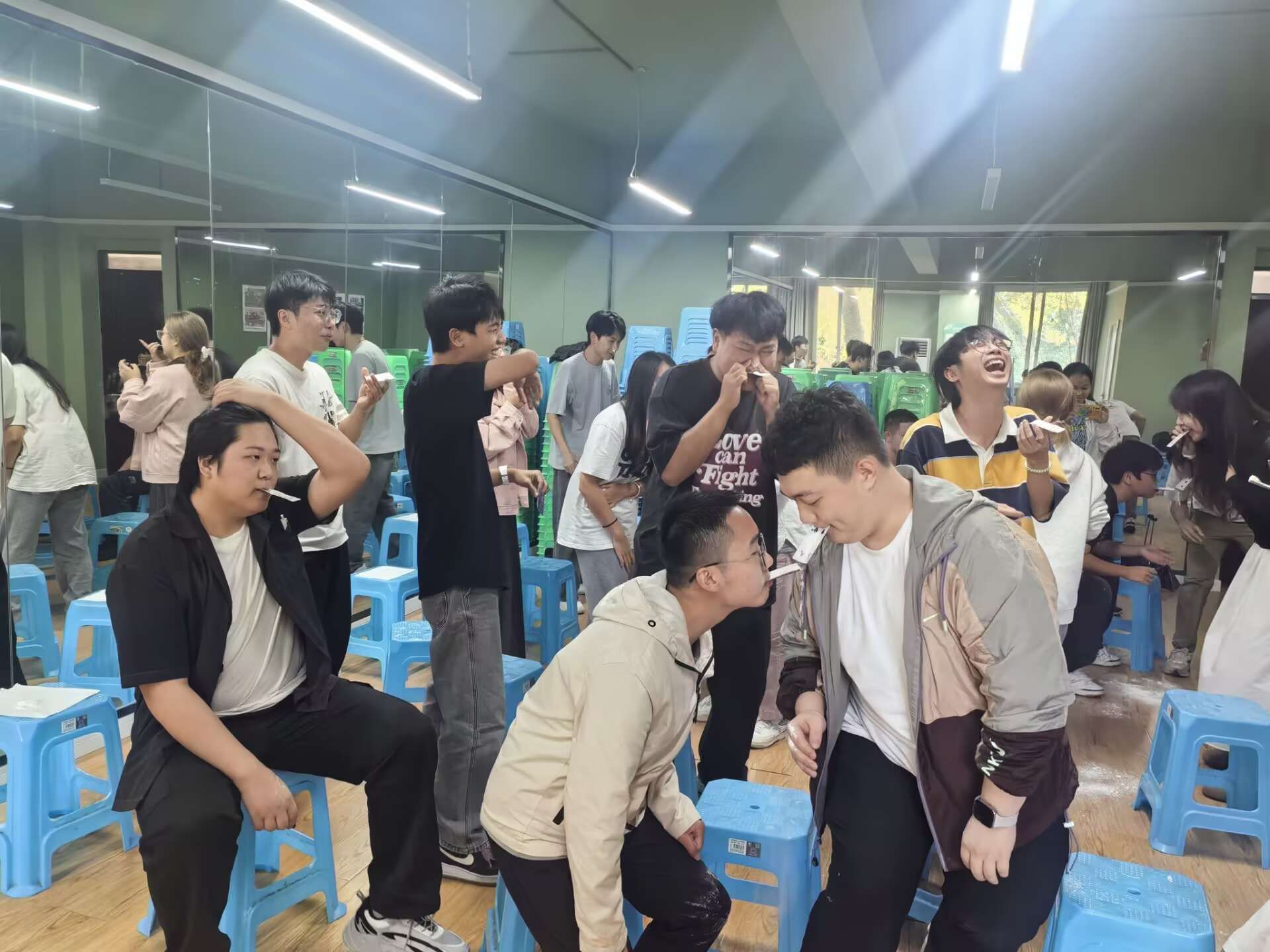 最后登场的“面粉接力”游戏考验着团队协作能力。游戏开始后,大家屏气凝神、小心翼翼,有的小组因配合不当导致面粉洒落,引得全场大笑;有的小组则凭借默契的节奏,高效完成接力。即便脸上沾了面粉变成“小花猫”,同学们也毫不在意,反而互相打趣、帮忙擦拭,现场充满了温馨友爱的气息。