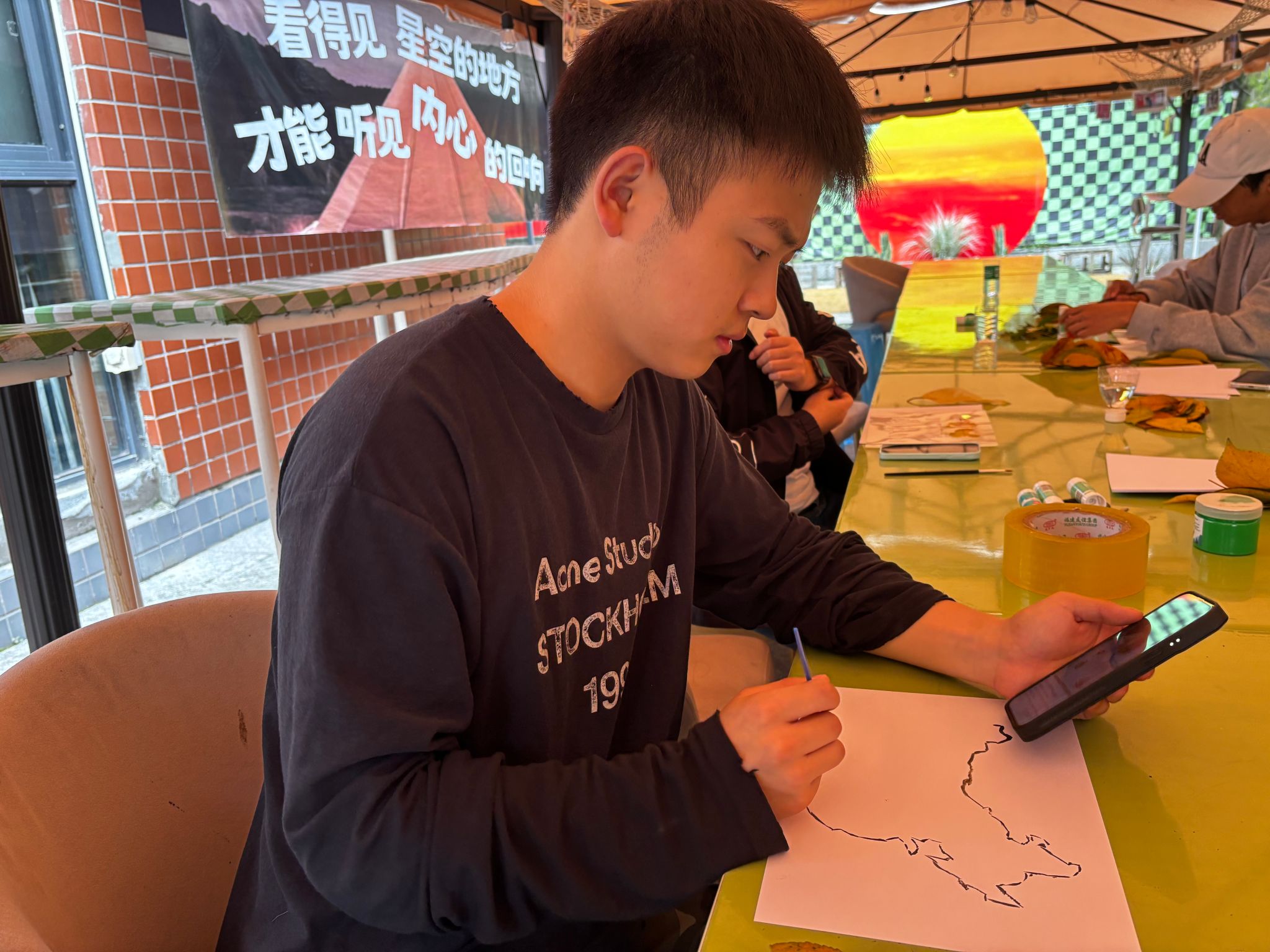 随后,创作环节有序开展。“一叶染山河”环节里,同学们用颜料涂抹落叶,在地图卡纸上拓印出多彩版图,以创意笔触“装点”祖国山河,深化家国情怀。在活动中,同学们协作勾勒轮廓,用棕黄、暗红等色调落叶拼贴“80”数字与五角星,再以红笔突出书写“中国”等字样,完成抗战胜利80周年主题作品。