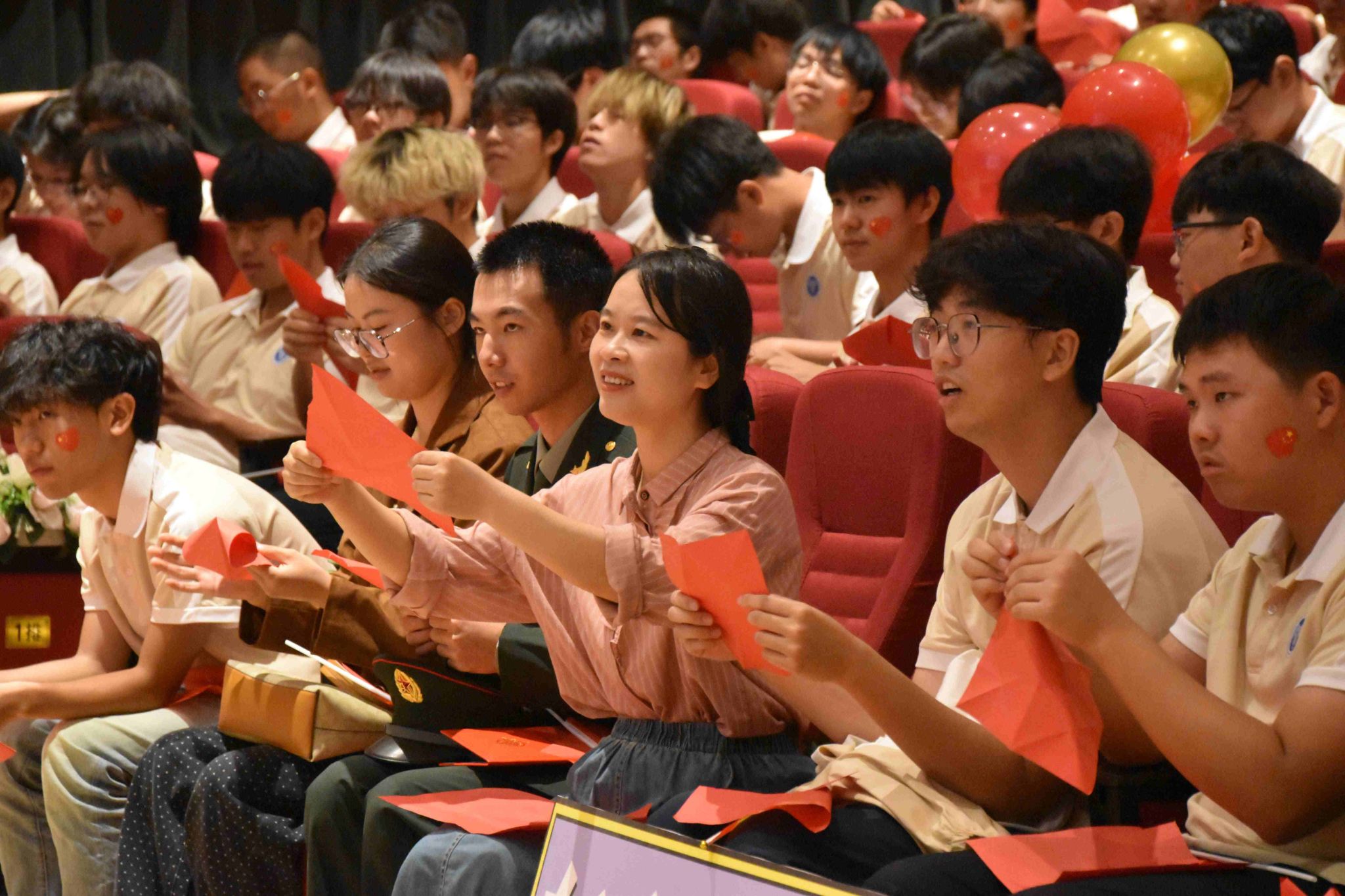 “誓言铿锵昭赤胆,丹心灼灼映山河”,在四位主持人的领誓下,全体师生起立,整齐划一地举起右拳。铿锵的誓言如潮水般响起,字字千钧,回荡在会场之中。每一句誓词,都饱含着赤诚的初心;每一次呐喊,都凝聚着坚定的信念。