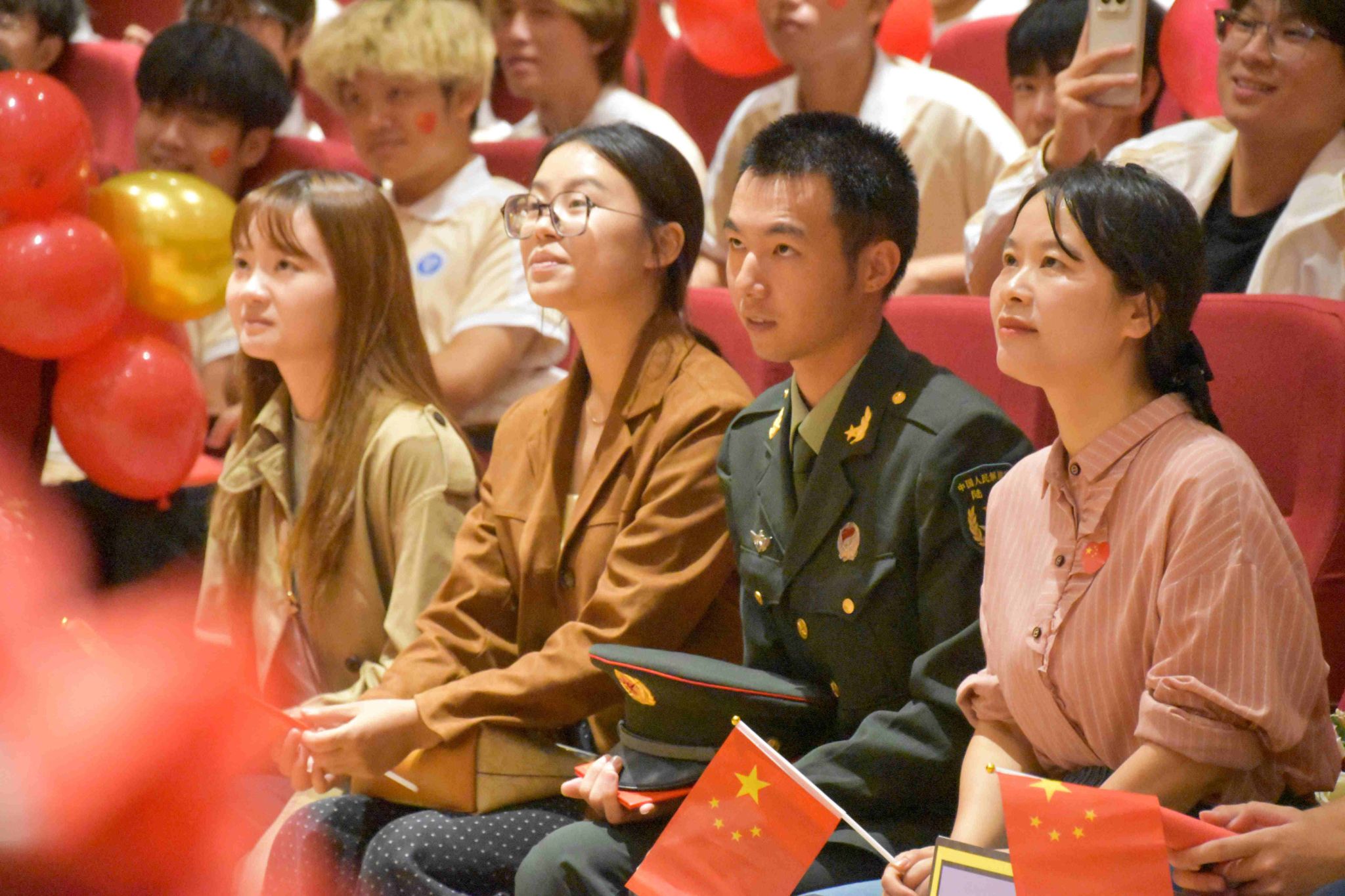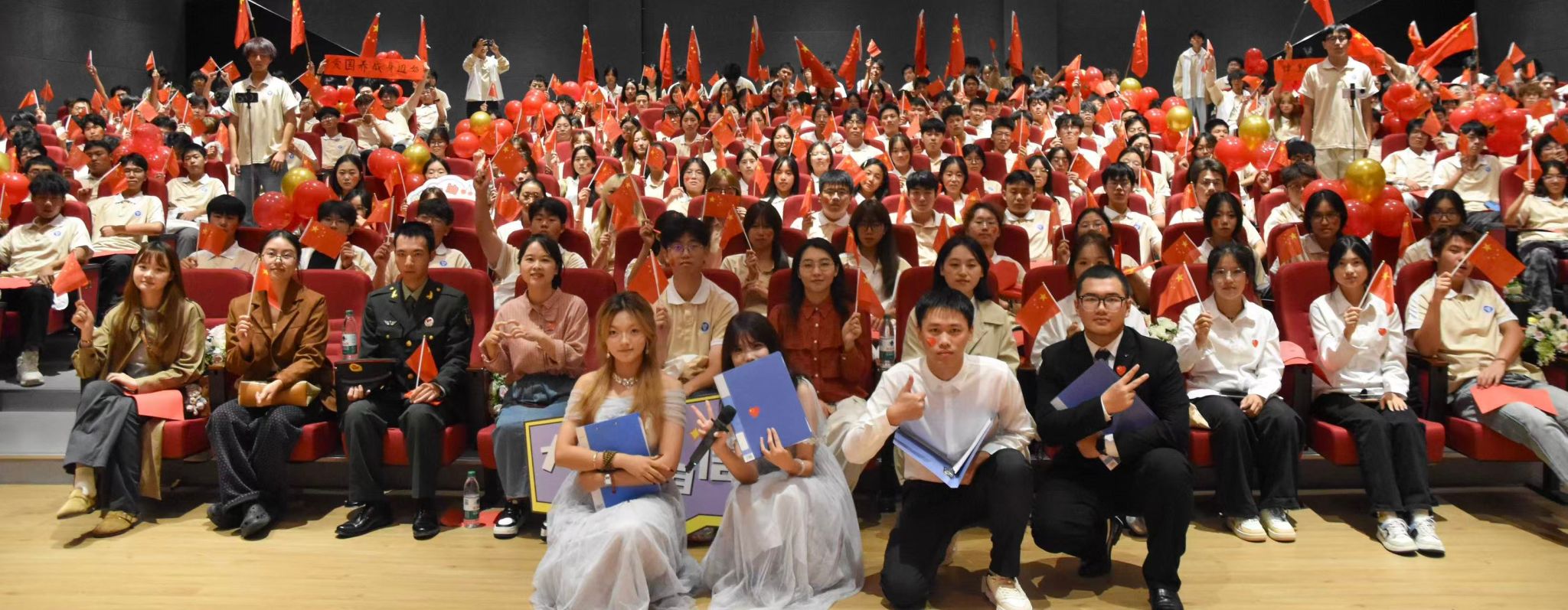 习近平总书记强调:“弘扬爱国主义精神,必须把爱国主义教育作为永恒主题。”爱国主义是中华民族精神的核心,对新时代中国青年来说,热爱祖国是立身之本、成才之基。为厚植青年爱国情怀、丰富“完满教育”实践载体、强化责任担当与家国情怀,辅导员马莉以班导师、年级长、班干部、党员、寝室长五个团队为依靠策划主题年级会,带领2025级电子信息类1-10班全体同学于10月15日晚上7点30分,在六度空间105度学术报告厅开展“爱国养成身边始,律动完满践于行”的主题年级会。通过搭建“认知-体验-践行”三维成长路径,现场还通过抖音直播,邀请远方的家长一起观看,共同推动爱国主义精神在青年学子心中落地生根,于完满日常行动中见行见效。