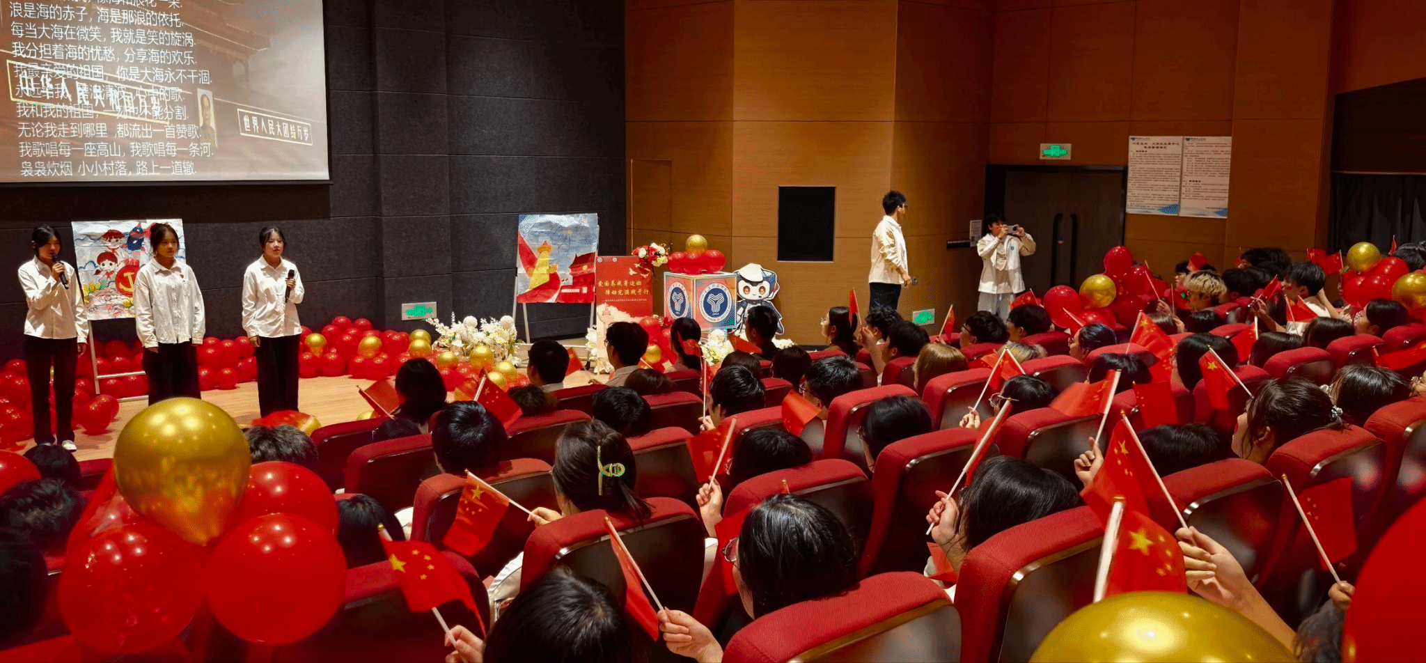 晚会气氛在《我和我的祖国》合唱中被推向高潮,在三位艺术达人的歌声中,全体师生以歌言志,以声传情。全场自发挥舞五星红旗,与激昂歌声交织成赤诚的海洋。同学们用青春之声赓续华夏深情,唱出与祖国共进的坚定信念,展现移通学子的朝气与担当。