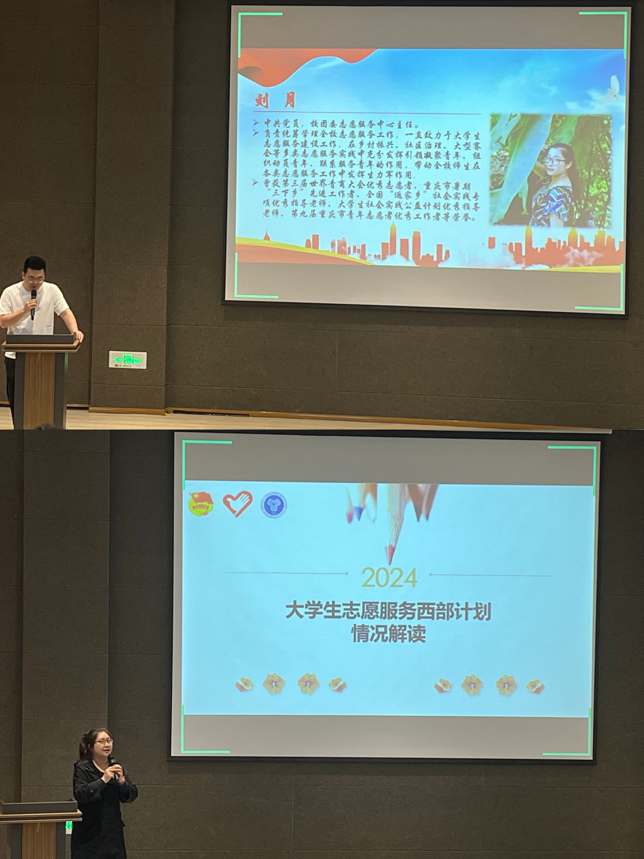 活动伊始,刘月老师首先解读了何为西部计划,对比了2021年前和2021年后西部计划项目,深入剖析了西部计划项目的最新动态与变化。她指出,今年的西部计划不仅延续了服务新疆、服务西藏等传统项目,还新增了乡村社会治理和卫国戍边两大领域,旨在更全面地支持西部地区的经济社会发展。除此之外,刘老师详细解读了报名流程,务必按照要求登录西部计划官网进行注册和报名,强调了体检和心理检测结果对于录用的重要性,并提醒同学们积极锻炼身体,强健体魄,注重身心健康。