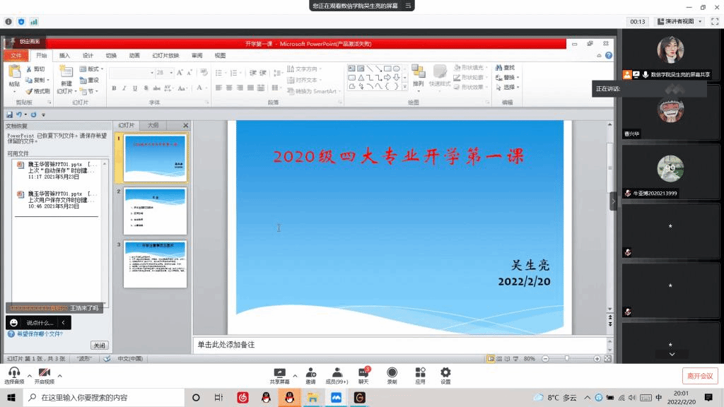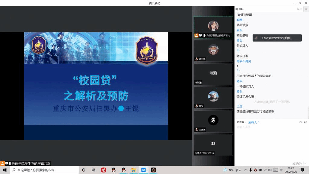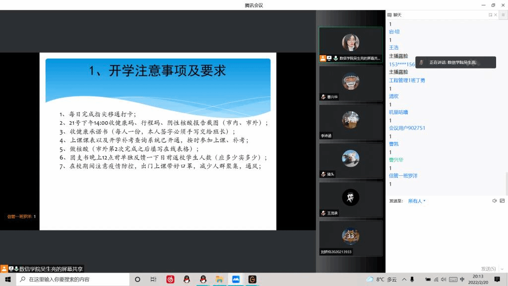为响应学校春季开学疫情防控、安全教育、心理健康等各方面要求,2022年2月20日20:00,数字经济与信息管理学院2020级四大专业259名同学在辅导员吴生亮老师的带领下开展了“2020级四大专业开学第一课”线上腾讯会议。会议伊始,吴生亮老师围绕开学注意事项及要求、疫情防控、安全教育以及心理教育四个方面做出了简要总结和要求。