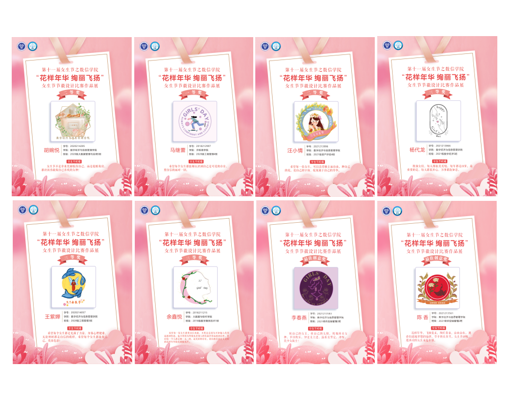 3月4日下午两点“花样年华”女生节节徽设计大赛在爱莲多功能影音室顺利开展。活动期间,参赛者们展示节徽设计内容丰富多彩,其中有以“白瘦美已不是当今的时代主流”为主题作品,也有以“鲜花、浪漫”为主题作品,更有以“镜子”“香水”等作为主题设计作品代表魅力女生,处处弥漫着青春气息。参赛者作品现场答辩完毕后,学院老师为每一位参赛者作品打分并做出点评,其中马继蕾、胡婉悦、汪小请、王紫婵、杨代龙、余鑫悦在此次活动中获奖。