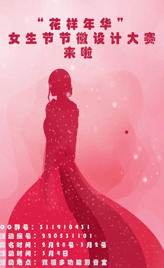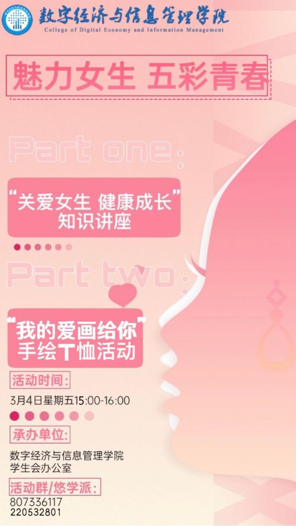 冬去春来,花开百里香,在这个浪漫的季节里,为丰富我校女生校园文化生活,引导广大女生关注自身发展,促进综合素质提高。重庆移通学院第十一届女生节踏春而来。数字经济与信息管理学院积极响应校学生会号召,开展“三·七女生节”系列活动。我院根据女生热点需要,特此开展“花样年华”女生节节徽设计大赛、“关爱女生,健康成长”知识讲座暨“我的爱画给你”手绘T恤活动、“女生悄悄话”与“我的爱画给你”T恤义卖活动。