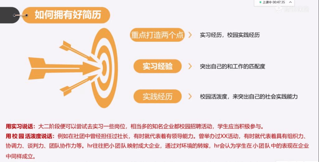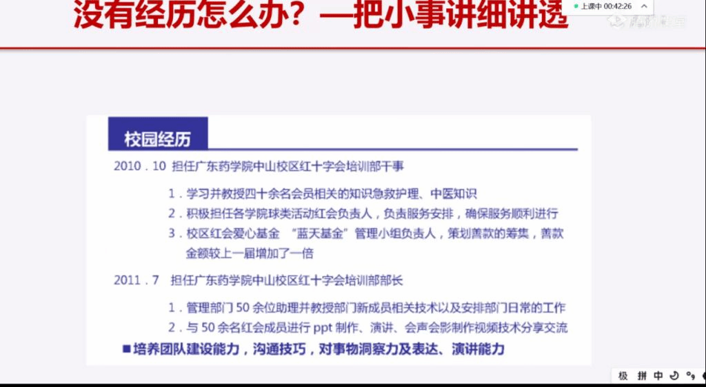 成长非一日而就,一份优秀的简历也需要不断修改。相信经过黄新燕老师的线上教导和分享,加之线下老师们对同学们的简历进行集体修改后,同学们不仅能收获一份更完美的简历,在升华的过程中也能逐渐明晰个人职业规划。希望经过此次讲座,简历能够成为同学们结实的敲门砖,为求职增加筹码,都能获得心中所求之职,毕业即就业。