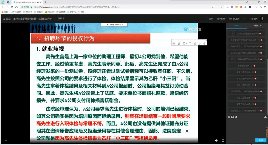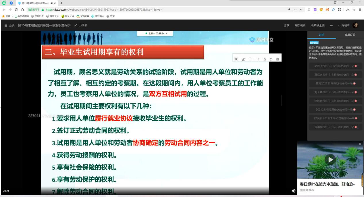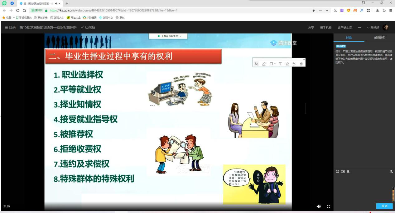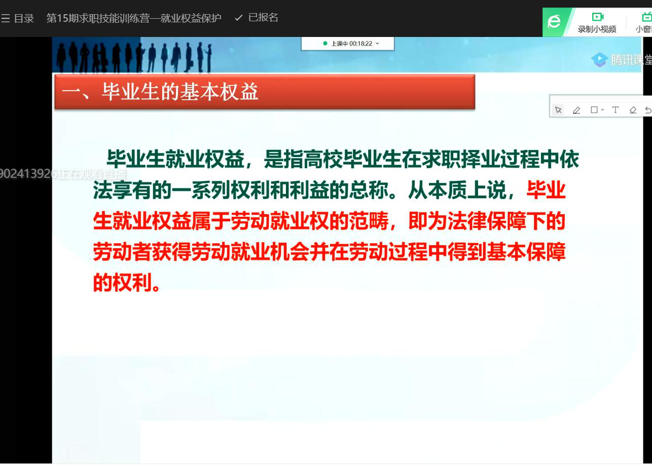 在全面进行防骗反诈的大环境下,为帮助即将面对就业的毕业生们提高维权意识,学会用法律维护自身合法权益,我院于3月31日15:00在腾讯课堂线上开讲——“职场扬帆,逐梦启航—就业权益保护”第15期求职技能训练营。本期求职技能训练营针对我院毕业年级学生开展,吸引各年级同学参与,有幸邀请到我院社团活动版块指导老师——张婷老师对初次入职时常见劳动法律问题开展专题普法宣传,讲述劳动法律实务相关内容。