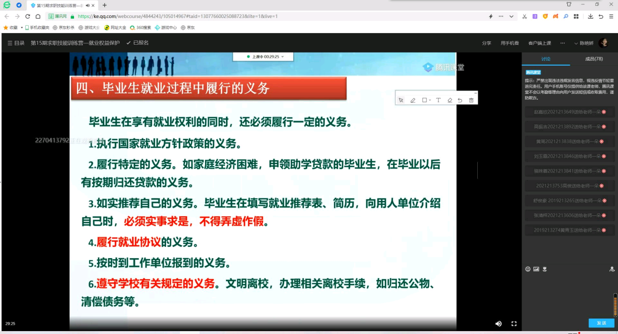 权利和义务互为整体、不可分割,作为一名中国公民我们不仅在享受国家给予我们的权利,还应该在享受的同时履行我们自身的义务。老师为同学们逐个介绍大学生毕业后就业时应该遵循的行为,了解权利、履行义务,才能更好就业,大学生就业对社会、对国家的意义与发展提供强大的推进作用。