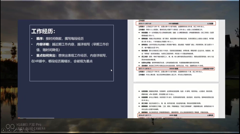 “简历在求职中是一个什么样的位置?”苏盼盼老师以一个开放式问题开启本次课程,同学们积极回复纷纷说出各自见解。大多同学都认为简历是求职中的第一关,但苏盼盼老师却给出了大相径庭的答案——简历实则是能否拿到offer的最后一关。简历信息量大,HR通过阅读能从中了解到求职者基本信息、教育背景、工作经历等,并初步判断是否符合岗位要求,能否胜任此项工作。苏盼盼老师通过这样一个简单的问题让大家了解到简历在求职过程中的重要性,自然而然地引入此次简历制作课程。