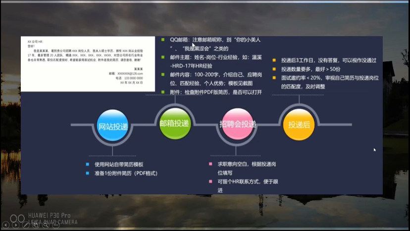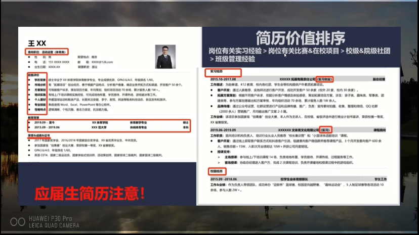 此次线上课堂面对全校各年级同学,考虑到部分同学并未接触过简历制作,苏盼盼老师将简历划分为个人信息、实践经历、教育背景、个人技能、求职意向及奖励情况,共六个方面进行教学。由简至繁,循序渐进,苏老师提出简历重要的在于其中文字,一般以蓝色或灰色为主,简约直观,简历整体有逻辑有条理利于在面试时提供清晰思路。在个人信息部分,形象照是要点,照片要体现出积极向上阳光开朗的精神面貌,对形象有所要求的岗位建议放置美观商务照,给面试官留下良好印象。