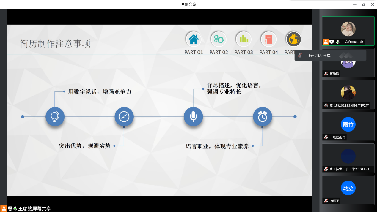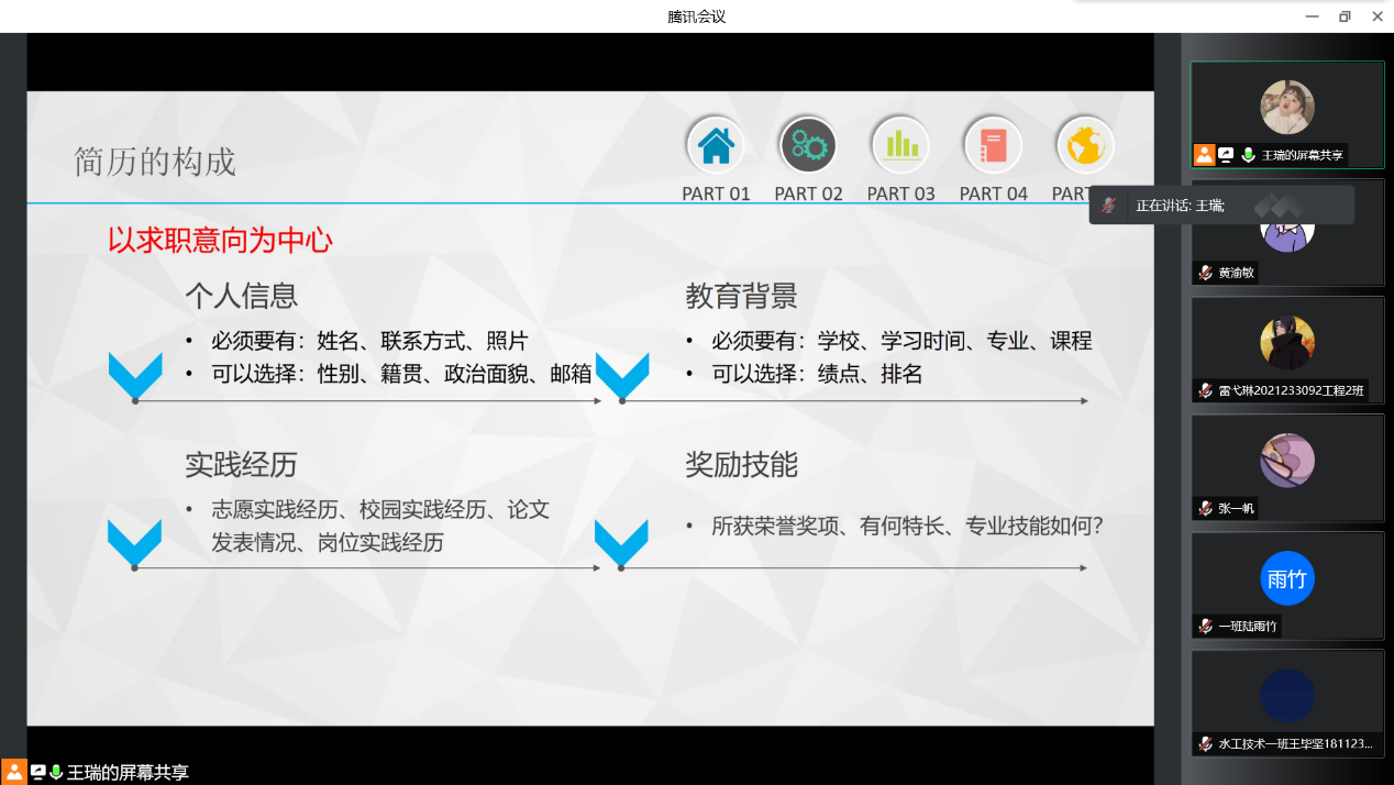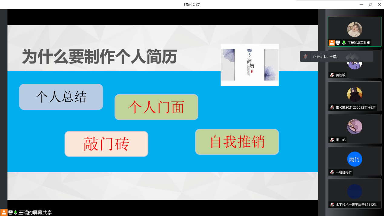 在人才竞争激烈的时代,简历的重要性不言而喻。简历作为求职的敲门砖,它需要最大程度地将自己的优势体现出来,使得HR快速且全方位了解求职者能力。为提升学生简历制作水平,增强简历竞争水平,我院于2022年4月20日19:00通过线上展开第20期求职技能训练营活动。此次活动,我们有幸邀请到志愿服务及宣传推广版块指导老师王瑞老师为我们分享简历制作技巧与注意事项。