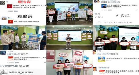 大学生法治安全教育是新时期思想政治教育的一项重要而艰巨的任务。为提升同学们的法律意识,树立正确的法律观念,数字经济与信息管理学院 2021 级专升本三大专业于4月20日14:30开展“勿以法治其小而不学,勿以规则其小而不为”主题年级会。因疫情防控要求,此次主题年级会采取线上线下相结合的方式,以双栀书院多功能影音室为线下会场,其余同学在宿舍、自习室、图书馆等地通过线上腾讯会议参与此次年级会。本次主题年级会还特别邀请到远景学院“猫头鹰”防诈中心杨斌誉老师参会。
