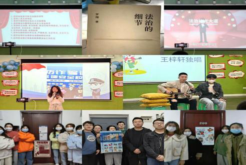 少年强,则国强,为了这次的年级会,同学们前期做足了功课,有去查阅相关书籍的,有去观看罗翔老师视频的,还有去观看相关法治节目的,可谓八仙过海各显神通。年级会上,由简开宇和赵文婷同学作为学生代表上台为大家分享自己宿舍的海报制作理念,为大家解密年级会背后的故事。王梓轩同学发挥自己的音乐才能,用同学们听得懂的语言普及法律知识,吉他声声拨动着同学们的心弦,“醒来了梦散了你我都被骗了”、“我们的融资没有皱着,只能被诈骗烫下句点”改编后的歌曲,与规则、反诈相结合,以诙谐幽默的方式让同学们再次感受到“法治”、“反诈”的重要性,其实它们时时刻刻都围绕在我们身边。