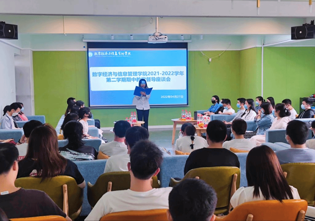 为进一步落实本学期教学质量评价工作,深化教学改革,提高教学质量,增强学风建设,更好地听取广大学生在校全面深化改革过程中对教学、管理、服务等方面的意见和建议,增强工作针对性,提高服务学生效能。我院于4月27日16:00在双栀书院多功能影音室开展数字经济与信息管理学院2021-2022学年第二学期期中教学座谈会。出席此次座谈会的嘉宾有数字经济与信息管理学院副院长刘贵容教授,数字经济与信息管理学院副院长任瑞娟老师,思政教学部代表杨勇老师,团委骨干老师肖哲老师,教务处孙亚栋老师,数理教学部陈本菊老师、李淑香老师,通识部教师代表李娇老师,学生处吴雷方成老师,外国语学院曲美玉老师,淬炼商学院王草老师,数字经济与信息管理学院周梦娇老师、王哲老师、团总支书记马莉老师,任课老师代表以及我院各年级各专业学生代表。