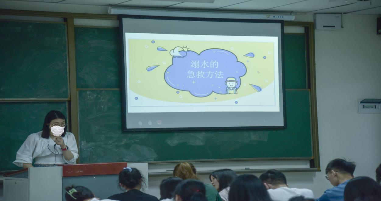 在轻松有趣的环境下,“防溺水安全教育”年级会拉开了帷幕。首先,吴生亮老师讲解了溺水的急救方法。老师以自身为例,讲解以前考取救生员证的经历,并建议我们,尽管已经拥有了相关证书,也要在保证自身安全的情况下急救他人。如果仅仅是会游泳,更不能盲目下水救人,赠人玫瑰,手有余香。那么,溺水的急救方法究竟有哪些?主要有两步,倒水和心肺复苏。