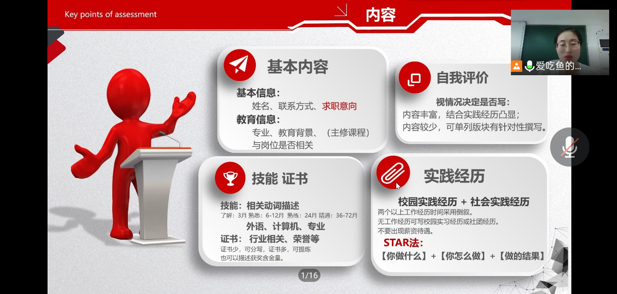 此次简历制作课程旨在培养同学们的规划思维、明确就业方向、拓展就业空间,增强忧患意识与竞争能力。郭淼老师从具体职位进行具体分析,指出具体职位信息,帮助同学们理解短视频中的简历要求,让同学们真正明白何种简历能从众多求职者中脱颖而出,有助于我院同学更好树立职业目标,掌握简历撰写技巧及科学合理地构筑人生蓝图。