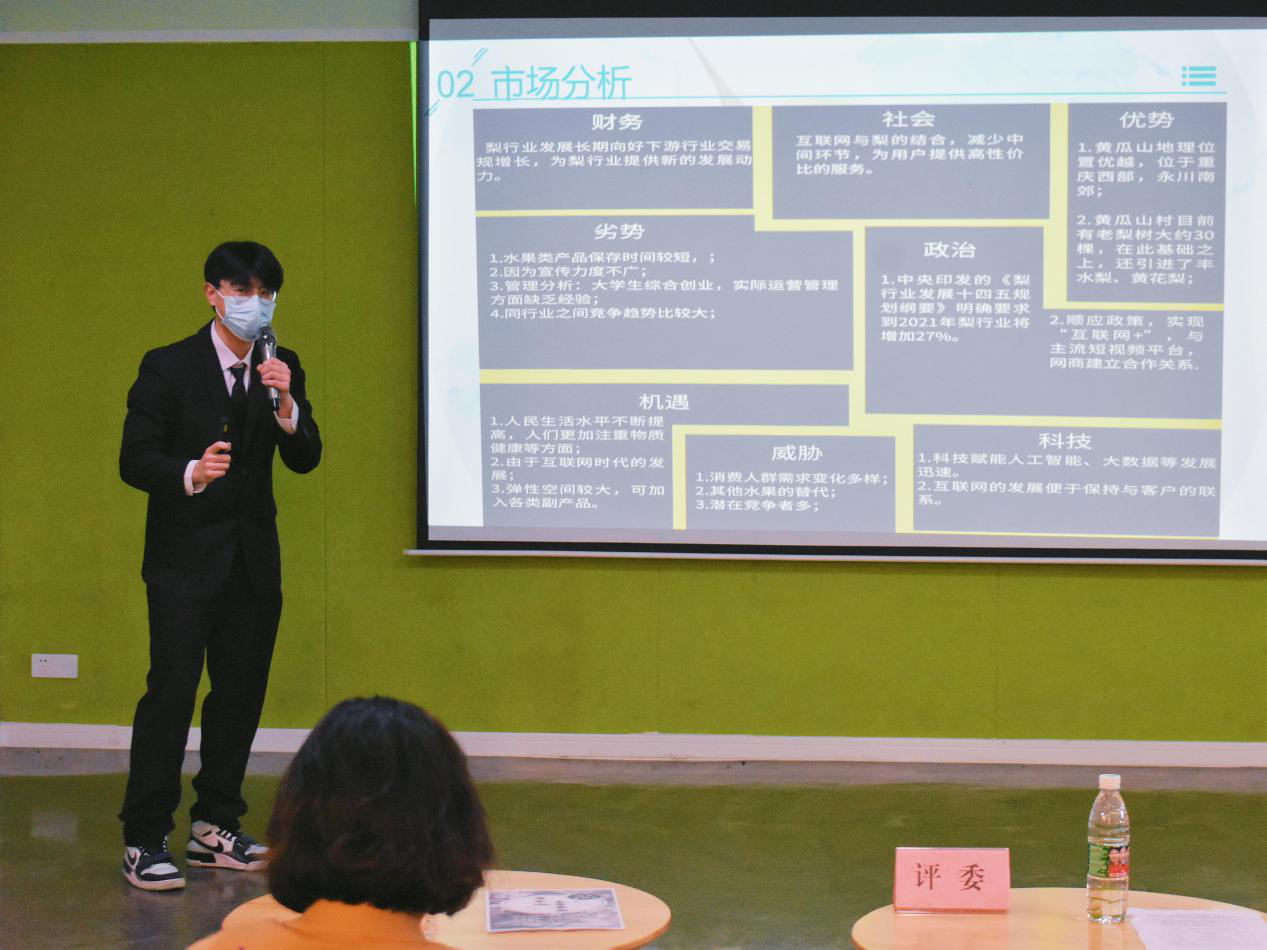 经过初赛选拔推荐,此次共有21支参赛队伍进入院级决赛,参赛作品以“原创性、创新性、可行性”为原则,由学生自主选题设计,老师指导完成。比赛始前,由主持人介绍比赛流程,比赛分为团队创新创业计划书展示和提问答辩两个环节。各参赛队伍向老师展示本队创新创业计划书并上台进行3分钟答辩,答辩结束后由老师进行提问,评分标准为创新性占比30%,商业性占比40%,团队情况与发展前景占比20%,综合表现占比10%,计算出最终得分进行排名。