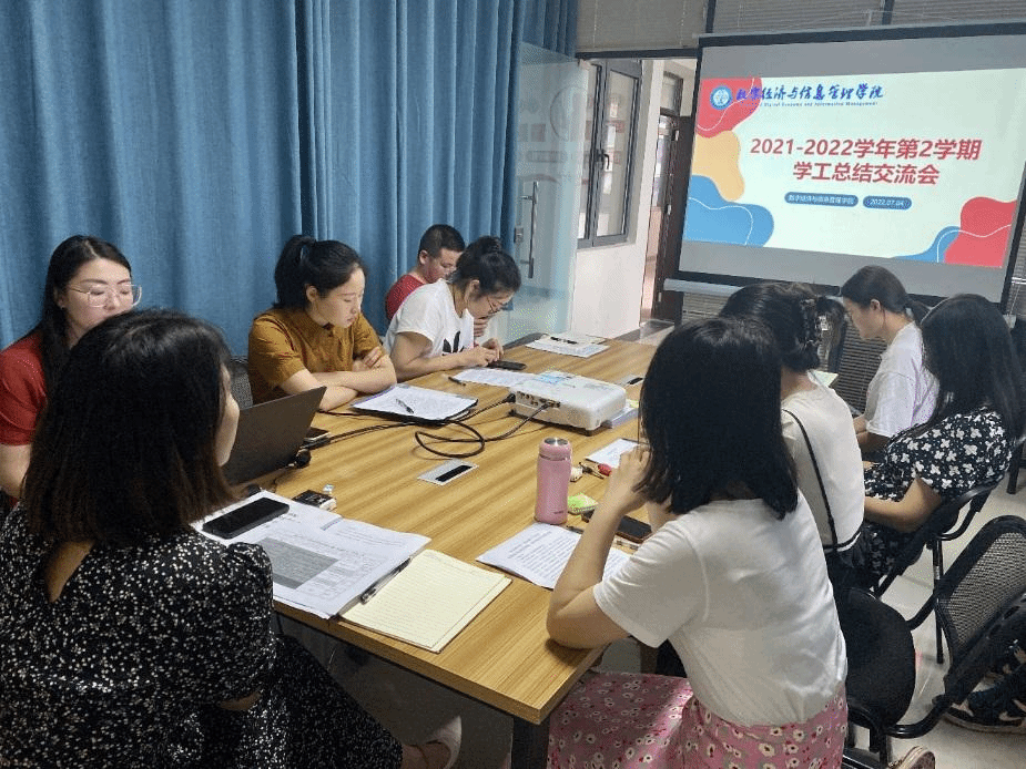 岁月如梭,时光荏苒,本学期各项工作即将结束。为总结学期工作,增强学生工作队伍凝聚力,梳理完满教育工作思路,为下一学期工作把舵定向,数字经济与信息管理学院2021-2022学年第2学期学工总结交流会于2022年7月4日10:00在双栀书院206办公室顺利召开。参与此次总结交流会的有数字经济与信息管理学院学工副院长任瑞娟老师、学院全体辅导员及三届三任团总支学生会主席团成员。