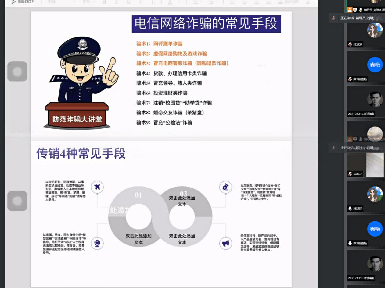 防诈不放假,开心过暑假。辅导员刘琳老师分享犯罪分子非法获取学生干部邮箱,冒充学生干部向熟人、领导索取钱财的诈骗案例,进一步介绍电信网络诈骗犯罪分子惯用手法、作案方式,如杀猪盘、校园贷诈骗。在反诈保护圈的作用下,辅导员刘琳老师希望同学们做到不点击未知链接,不轻信陌生来电,转账汇款多核实,不轻信兼职低成本高额回报的传销口号,需要学生们擦亮自己眼睛,不轻信“天上掉馅饼”。同学们在学习防诈骗知识、提高识骗防骗能力、增强自我防范意识的同时,也应懂得切实维护自身合法权益。