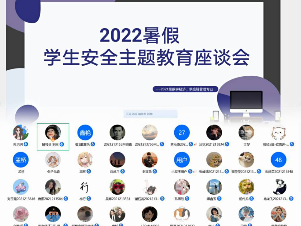 为加强学校与学生、家长的联系和沟通,强化警示教育,确保学生生命健康,2022年7月26日,数字经济与信息管理学院2021级数字经济、供应链管理专业采用线上会议方式,开展安全主题教育活动,涵盖防溺水、防诈骗、防传销以及疫情防控下的自我防护。本次活动由辅导员刘琳老师主持展开。